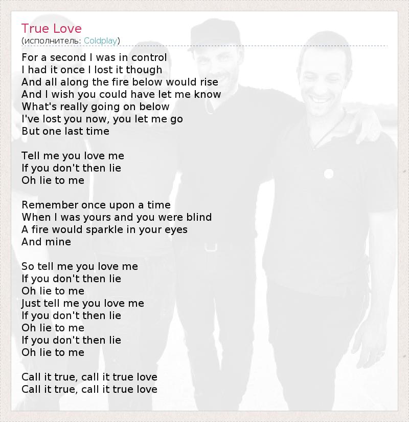 На мгновение я был под контролем. У меня был один шанс, и я его все-таки потерял. Все время огонь внизу рос, Как жаль, чтобы ты не позволила мне узнать, Что же на самом деле происходит там, внизу, Теперь я тебя потерял, ты отпустила меня, Но в последний раз Скажи, что ты любишь меня, Если нет, то соври. О, соври мне. Помню тогда, Когда я был твой, а ты была ослеплена, Огонь сверкал в твоих глазах И в моих. Скажи, что ты любишь меня, Если нет, то соври. О, соври мне. Просто скажи, ты любишь меня, Если нет, то соври. О, соври мне. Если нет, то соври. О, соври мне. Это истинная, это истинная любовь, Это истинная, это истинная любовь.