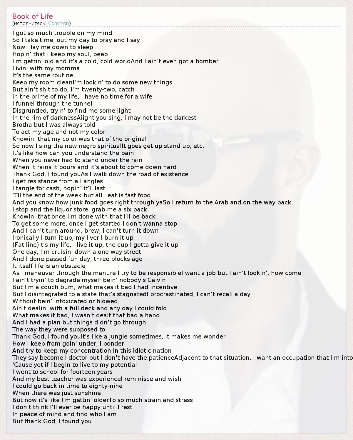 I got so much trouble on my mind So I take time, out my day to pray and I say Now I lay me down to sleep Hopin' that I keep my soul, peep I'm gettin' old and it's a cold, cold worldAnd I ain't even got a bomber Livin' with my momma It's the same routine Keep my room cleanI'm lookin' to do some new things But ain't shit to do, I'm twenty-two, catch In the prime of my life, I have no time for a wife I funnel through the tunnel Disgruntled, tryin' to find me some light In the rim of darknessAiight you sing, I may not be the darkest Brotha but I was always told To act my age and not my color Knowin' that my color was that of the original So now I sing the new negro spiritualIt goes get up stand up, etc. It's like how can you understand the pain When you never had to stand under the rain When it rains it pours and it's about to come down hard Thank God, I found youAs I walk down the road of existence I get resistance from all angles I tangle for cash, hopin' it'll last 'Til the end of the week but all I eat is fast food And you know how junk food goes right through yaSo I return to the Arab and on the way back I stop and the liquor store, grab me a six pack Knowin' that once I'm done with that I'll be back To get some more, once I get started I don't wanna stop And I can't turn around, brew, I can't turn it down Ironically I turn it up, my liver I burn it up (Fat line)It's my life, I live it up, the cup I gotta give it up One day, I'm cruisin' down a one way street And I done passed fun day, three blocks ago It itself life is an obstacle As I maneuver through the manure I try to be responsibleI want a job but I ain't lookin', how come I ain't tryin' to degrade myself bein' nobody's Calvin But I'm a couch bum, what makes it bad I had incentive But I disintegrated to a state that's stagnatedI procrastinated, I can't recall a day Without bein' intoxicated or blowed Ain't dealin' with a full deck and any day I could fold What makes it bad, I wasn't dealt that bad a hand And I had a plan but things didn't go through The way they were supposed to Thank God, I found youIt's like a jungle sometimes, it makes me wonder How I keep from goin' under, I ponder And try to keep my concentration in this idiotic nation They say become I doctor but I don't have the patienceAdjacent to that situation, I want an occupation that I'm into 'Cause yet if I begin to live to my potential I went to school for fourteen years And my best teacher was experienceI reminisce and wish I could go back in time to eighty-nine When there was just sunshine But now it's like I'm gettin' olderTo so much strain and stress I don't think I'll ever be happy until I rest In peace of mind and find who I am But thank God, I found you