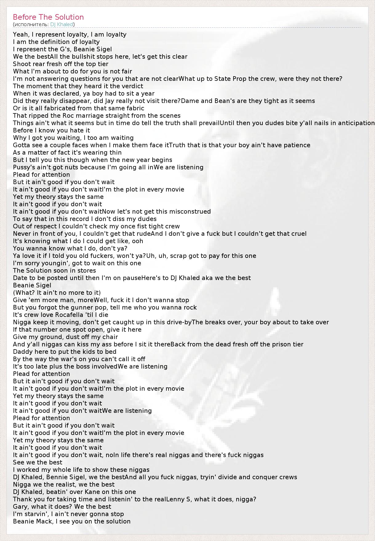 Yeah, I represent loyalty, I am loyalty I am the definition of loyalty I represent the G's, Beanie Sigel We the bestAll the bullshit stops here, let's get this clear Shoot rear fresh off the top tier What I'm about to do for you is not fair I'm not answering questions for you that are not clearWhat up to State Prop the crew, were they not there? The moment that they heard it the verdict When it was declared, ya boy had to sit a year Did they really disappear, did Jay really not visit there?Dame and Bean's are they tight as it seems Or is it all fabricated from that same fabric That ripped the Roc marriage straight from the scenes Things ain't what it seems but in time do tell the truth shall prevailUntil then you dudes bite y'all nails in anticipation Before I know you hate it Why I got you waiting, I too am waiting Gotta see a couple faces when I make them face itTruth that is that your boy ain't have patience As a matter of fact it's wearing thin But I tell you this though when the new year begins Pussy's ain't got nuts because I'm going all inWe are listening Plead for attention But it ain't good if you don't wait It ain't good if you don't waitI'm the plot in every movie Yet my theory stays the same It ain't good if you don't wait It ain't good if you don't waitNow let's not get this misconstrued To say that in this record I don't diss my dudes Out of respect I couldn't check my once fist tight crew Never in front of you, I couldn't get that rudeAnd I don't give a fuck but I couldn't get that cruel It's knowing what I do I could get like, ooh You wanna know what I do, don't ya? Ya love it if I told you old fuckers, won't ya?Uh, uh, scrap got to pay for this one I'm sorry youngin', got to wait on this one The Solution soon in stores Date to be posted until then I'm on pauseHere's to DJ Khaled aka we the best Beanie Sigel (What? It ain't no more to it) Give 'em more man, moreWell, fuck it I don't wanna stop But you forgot the gunner pop, tell me who you wanna rock It's crew love Rocafella 'til I die Nigga keep it moving, don't get caught up in this drive-byThe breaks over, your boy about to take over If that number one spot open, give it here Give my ground, dust off my chair And y'all niggas can kiss my ass before I sit it thereBack from the dead fresh off the prison tier Daddy here to put the kids to bed By the way the war's on you can't call it off It's too late plus the boss involvedWe are listening Plead for attention But it ain't good if you don't wait It ain't good if you don't waitI'm the plot in every movie Yet my theory stays the same It ain't good if you don't wait It ain't good if you don't waitWe are listening Plead for attention But it ain't good if you don't wait It ain't good if you don't waitI'm the plot in every movie Yet my theory stays the same It ain't good if you don't wait It ain't good if you don't wait, noIn life there's real niggas and there's fuck niggas See we the best I worked my whole life to show these niggas DJ Khaled, Bennie Sigel, we the bestAnd all you fuck niggas, tryin' divide and conquer crews Nigga we the realist, we the best DJ Khaled, beatin' over Kane on this one Thank you for taking time and listenin' to the realLenny S, what it does, nigga? Gary, what it does? We the best I'm starvin', I ain't never gonna stop Beanie Mack, I see you on the solution