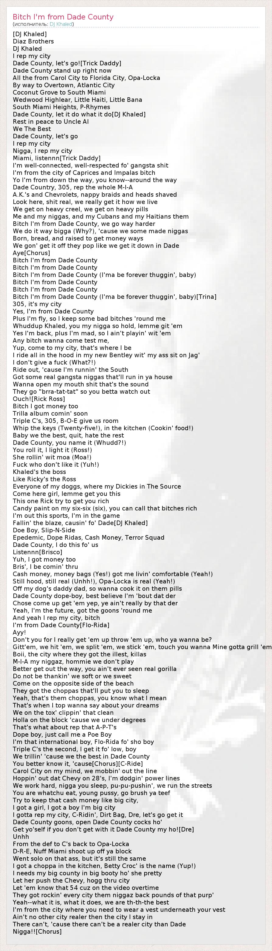 [DJ Khaled] Diaz Brothers DJ Khaled I rep my city Dade County, let's go![Trick Daddy] Dade County stand up right now All the from Carol City to Florida City, Opa-Locka By way to Overtown, Atlantic City Coconut Grove to South Miami Wedwood Highlear, Little Haiti, Little Bana South Miami Heights, P-Rhymes Dade County, let it do what it do[DJ Khaled] Rest in peace to Uncle Al We The Best Dade County, let's go I rep my city Nigga, I rep my city Miami, listennn[Trick Daddy] I'm well-connected, well-respected fo' gangsta shit I'm from the city of Caprices and Impalas bitch Yo I'm from down the way, you know--around the way Dade Country, 305, rep the whole M-I-A A.K.'s and Chevrolets, nappy braids and heads shaved Look here, shit real, we really get it how we live We get on heavy creel, we get on heavy pills Me and my niggas, and my Cubans and my Haitians them Bitch I'm from Dade County, we go way harder We do it way bigga (Why?), 'cause we some made niggas Born, bread, and raised to get money ways We gon' get it off they pop like we get it down in Dade Aye[Chorus] Bitch I'm from Dade County Bitch I'm from Dade County Bitch I'm from Dade County (I'ma be forever thuggin', baby) Bitch I'm from Dade County Bitch I'm from Dade County Bitch I'm from Dade County (I'ma be forever thuggin', baby)[Trina] 305, it's my city Yes, I'm from Dade County Plus I'm fly, so I keep some bad bitches 'round me Whuddup Khaled, you my nigga so hold, lemme git 'em Yes I'm back, plus I'm mad, so I ain't playin' wit 'em Any bitch wanna come test me, Yup, come to my city, that's where I be I ride all in the hood in my new Bentley wit' my ass sit on Jag' I don't give a fuck (What?!) Ride out, 'cause I'm runnin' the South Got some real gangsta niggas that'll run in ya house Wanna open my mouth shit that's the sound They go "brra-tat-tat" so you betta watch out Ouch![Rick Ross] Bitch I got money too Trilla album comin' soon Triple C's, 305, B-O-E give us room Whip the keys (Twenty-five!), in the kitchen (Cookin' food!) Baby we the best, quit, hate the rest Dade County, you name it (Whudd?!) You roll it, I light it (Ross!) She rollin' wit moa (Moa!) Fuck who don't like it (Yuh!) Khaled's the boss Like Ricky's the Ross Everyone of my doggs, where my Dickies in The Source Come here girl, lemme get you this This one Rick try to get you rich Candy paint on my six-six (six), you can call that bitches rich I'm out this sports, I'm in the game Fallin' the blaze, causin' fo' Dade[DJ Khaled] Doe Boy, Slip-N-Side Epedemic, Dope Ridas, Cash Money, Terror Squad Dade County, I do this fo' us Listennn[Brisco] Yuh, I got money too Bris', I be comin' thru Cash money, money bags (Yes!) got me livin' comfortable (Yeah!) Still hood, still real (Unhh!), Opa-Locka is real (Yeah!) Off my dog's daddy dad, so wanna cook it on them pills Dade County dope-boy, best believe I'm 'bout dat der Chose come up get 'em yep, ye ain't really by that der Yeah, I'm the future, got the goons 'round me And yeah I rep my city, bitch I'm from Dade County[Flo-Rida] Ayy! Don't you for I really get 'em up throw 'em up, who ya wanna be? Gitt'em, we hit 'em, we split 'em, we stick 'em, touch you wanna Mine gotta grill 'em Boii, the city where they got the illest, killas M-I-A my niggaz, hommie we don't play Better get out the way, you ain't ever seen real gorilla Do not be thankin' we soft or we sweet Come on the opposite side of the beach They got the choppas that'll put you to sleep Yeah, that's them choppas, you know what I mean That's when I top wanna say about your dreams We on the tox' clippin' that clean Holla on the block 'cause we under degrees That's what about rep that A-P-T's Dope boy, just call me a Poe Boy I'm that international boy, Flo-Rida fo' sho boy Triple C's the second, I get it fo' low, boy We trillin' 'cause we the best in Dade County You better know it, 'cause[Chorus][C-Ride] Carol City on my mind, we mobbin' out the line Hoppin' out dat Chevy on 28's, I'm dodgin' power lines We work hard, nigga you sleep, pu-pu-pushin', we run the streets You are whatchu eat, young pussy, go brush ya teef Try to keep that cash money like big city, I got a girl, I got a boy I'm big city I gotta rep my city, C-Ridin', Dirt Bag, Dre, let's go get it Dade County goons, open Dade County cocks ho' Get yo'self if you don't get with it Dade County my ho![Dre] Unhh From the def to C's back to Opa-Locka D-R-E, Nuff Miami shoot up off ya block Went solo on that ass, but it's still the same I got a choppa in the kitchen, Betty Croc' is the name (Yup!) I needs my big county in big booty ho' she pretty Let her push the Chevy, hogg thru city Let 'em know that 54 cuz on the video overtime They got rockin' every city them niggaz back pounds of that purp' Yeah--what it is, what it does, we are th-th-the best I'm from the city where you need to wear a vest underneath your vest Ain't no other city realer then the city I stay in There can't, 'cause there can't be a realer city than Dade Nigga!![Chorus]