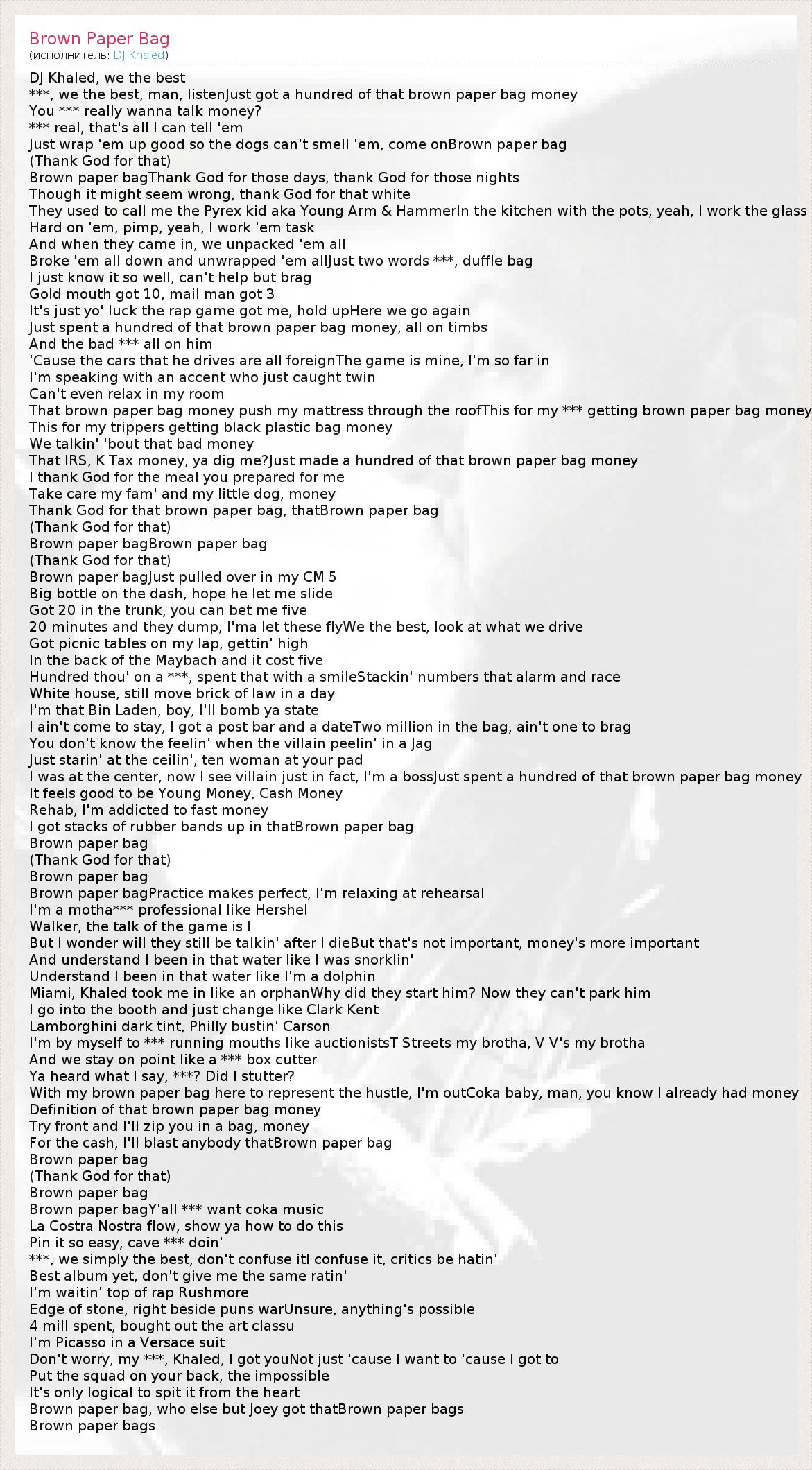 DJ Khaled, we the best ***, we the best, man, listenJust got a hundred of that brown paper bag money You *** really wanna talk money? *** real, that's all I can tell 'em Just wrap 'em up good so the dogs can't smell 'em, come onBrown paper bag (Thank God for that) Brown paper bagThank God for those days, thank God for those nights Though it might seem wrong, thank God for that white They used to call me the Pyrex kid aka Young Arm & HammerIn the kitchen with the pots, yeah, I work the glass Hard on 'em, pimp, yeah, I work 'em task And when they came in, we unpacked 'em all Broke 'em all down and unwrapped 'em allJust two words ***, duffle bag I just know it so well, can't help but brag Gold mouth got 10, mail man got 3 It's just yo' luck the rap game got me, hold upHere we go again Just spent a hundred of that brown paper bag money, all on timbs And the bad *** all on him 'Cause the cars that he drives are all foreignThe game is mine, I'm so far in I'm speaking with an accent who just caught twin Can't even relax in my room That brown paper bag money push my mattress through the roofThis for my *** getting brown paper bag money This for my trippers getting black plastic bag money We talkin' 'bout that bad money That IRS, K Tax money, ya dig me?Just made a hundred of that brown paper bag money I thank God for the meal you prepared for me Take care my fam' and my little dog, money Thank God for that brown paper bag, thatBrown paper bag (Thank God for that) Brown paper bagBrown paper bag (Thank God for that) Brown paper bagJust pulled over in my CM 5 Big bottle on the dash, hope he let me slide Got 20 in the trunk, you can bet me five 20 minutes and they dump, I'ma let these flyWe the best, look at what we drive Got picnic tables on my lap, gettin' high In the back of the Maybach and it cost five Hundred thou' on a ***, spent that with a smileStackin' numbers that alarm and race White house, still move brick of law in a day I'm that Bin Laden, boy, I'll bomb ya state I ain't come to stay, I got a post bar and a dateTwo million in the bag, ain't one to brag You don't know the feelin' when the villain peelin' in a Jag Just starin' at the ceilin', ten woman at your pad I was at the center, now I see villain just in fact, I'm a bossJust spent a hundred of that brown paper bag money It feels good to be Young Money, Cash Money Rehab, I'm addicted to fast money I got stacks of rubber bands up in thatBrown paper bag Brown paper bag (Thank God for that) Brown paper bag Brown paper bagPractice makes perfect, I'm relaxing at rehearsal I'm a motha*** professional like Hershel Walker, the talk of the game is I But I wonder will they still be talkin' after I dieBut that's not important, money's more important And understand I been in that water like I was snorklin' Understand I been in that water like I'm a dolphin Miami, Khaled took me in like an orphanWhy did they start him? Now they can't park him I go into the booth and just change like Clark Kent Lamborghini dark tint, Philly bustin' Carson I'm by myself to *** running mouths like auctionistsT Streets my brotha, V V's my brotha And we stay on point like a *** box cutter Ya heard what I say, ***? Did I stutter? With my brown paper bag here to represent the hustle, I'm outCoka baby, man, you know I already had money Definition of that brown paper bag money Try front and I'll zip you in a bag, money For the cash, I'll blast anybody thatBrown paper bag Brown paper bag (Thank God for that) Brown paper bag Brown paper bagY'all *** want coka music La Costra Nostra flow, show ya how to do this Pin it so easy, cave *** doin' ***, we simply the best, don't confuse itI confuse it, critics be hatin' Best album yet, don't give me the same ratin' I'm waitin' top of rap Rushmore Edge of stone, right beside puns warUnsure, anything's possible 4 mill spent, bought out the art classu I'm Picasso in a Versace suit Don't worry, my ***, Khaled, I got youNot just 'cause I want to 'cause I got to Put the squad on your back, the impossible It's only logical to spit it from the heart Brown paper bag, who else but Joey got thatBrown paper bags Brown paper bags