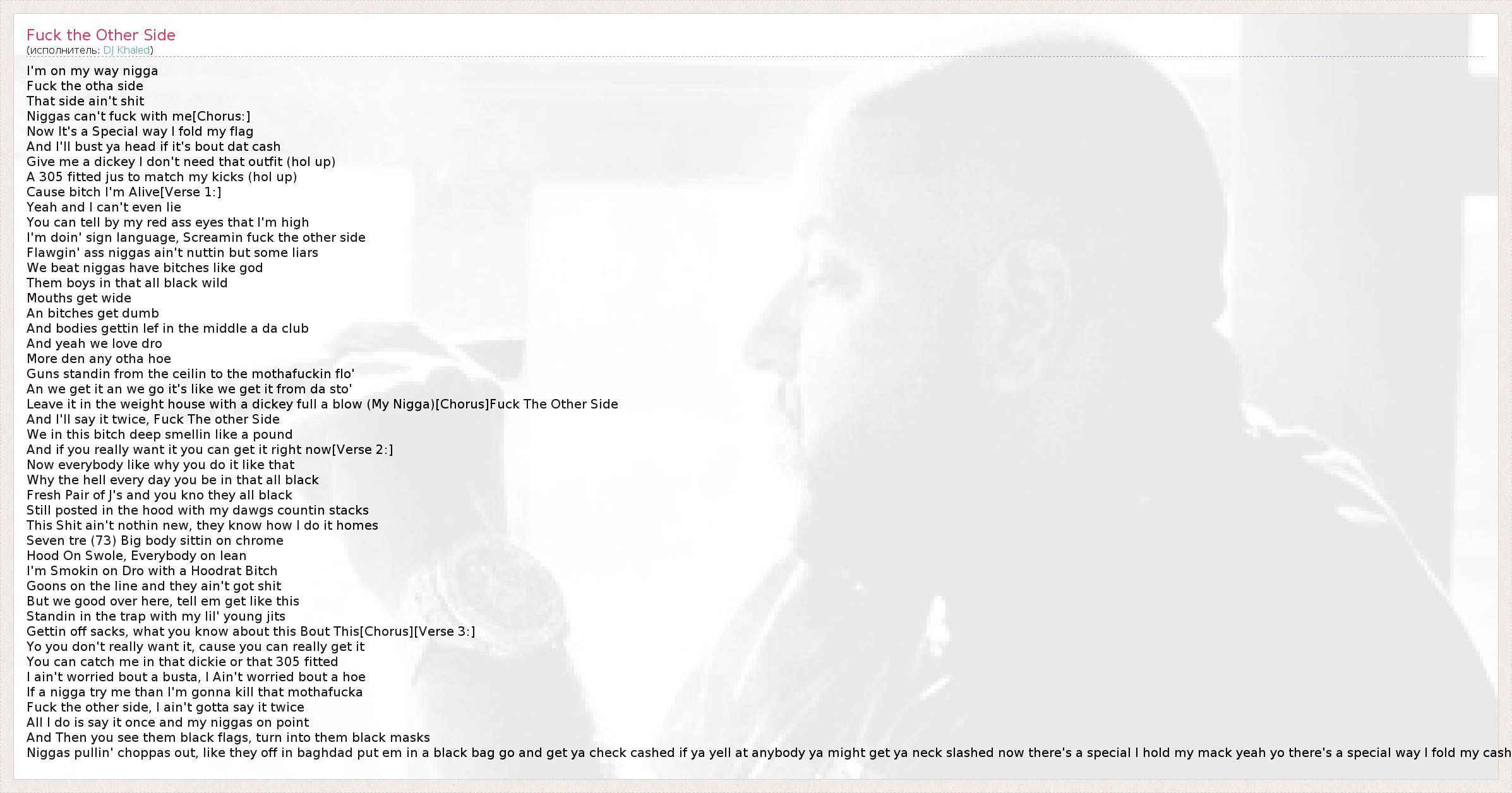 I'm on my way nigga Fuck the otha side That side ain't shit Niggas can't fuck with me[Chorus:] Now It's a Special way I fold my flag And I'll bust ya head if it's bout dat cash Give me a dickey I don't need that outfit (hol up) A 305 fitted jus to match my kicks (hol up) Cause bitch I'm Alive[Verse 1:] Yeah and I can't even lie You can tell by my red ass eyes that I'm high I'm doin' sign language, Screamin fuck the other side Flawgin' ass niggas ain't nuttin but some liars We beat niggas have bitches like god Them boys in that all black wild Mouths get wide An bitches get dumb And bodies gettin lef in the middle a da club And yeah we love dro More den any otha hoe Guns standin from the ceilin to the mothafuckin flo' An we get it an we go it's like we get it from da sto' Leave it in the weight house with a dickey full a blow (My Nigga)[Chorus]Fuck The Other Side And I'll say it twice, Fuck The other Side We in this bitch deep smellin like a pound And if you really want it you can get it right now[Verse 2:] Now everybody like why you do it like that Why the hell every day you be in that all black Fresh Pair of J's and you kno they all black Still posted in the hood with my dawgs countin stacks This Shit ain't nothin new, they know how I do it homes Seven tre (73) Big body sittin on chrome Hood On Swole, Everybody on lean I'm Smokin on Dro with a Hoodrat Bitch Goons on the line and they ain't got shit But we good over here, tell em get like this Standin in the trap with my lil' young jits Gettin off sacks, what you know about this Bout This[Chorus][Verse 3:] Yo you don't really want it, cause you can really get it You can catch me in that dickie or that 305 fitted I ain't worried bout a busta, I Ain't worried bout a hoe If a nigga try me than I'm gonna kill that mothafucka Fuck the other side, I ain't gotta say it twice All I do is say it once and my niggas on point And Then you see them black flags, turn into them black masks Niggas pullin' choppas out, like they off in baghdad put em in a black bag go and get ya check cashed if ya yell at anybody ya might get ya neck slashed now there's a special I hold my mack yeah yo there's a special way I fold my cash