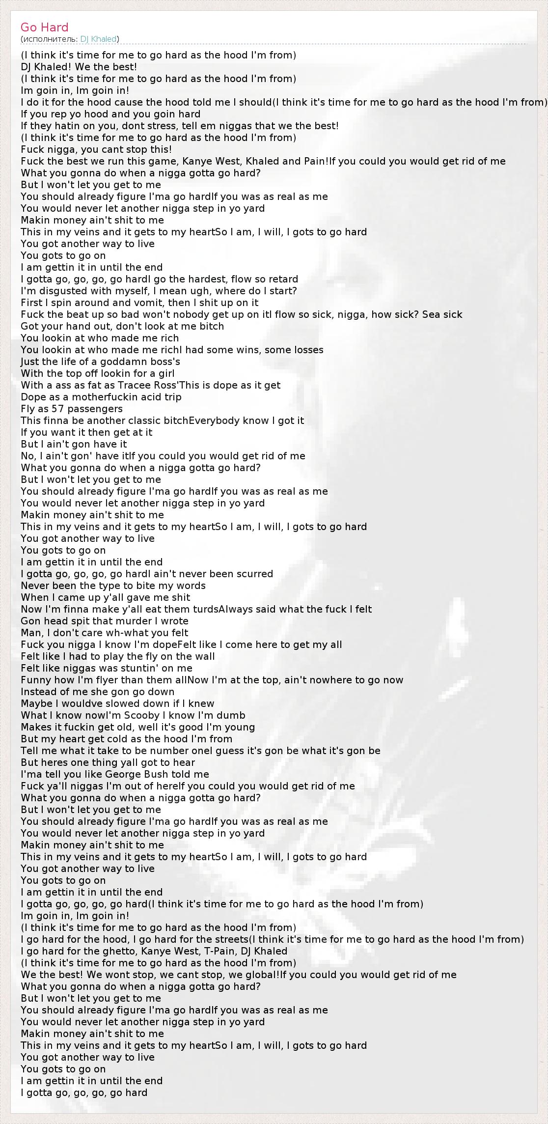 (I think it's time for me to go hard as the hood I'm from) DJ Khaled! We the best! (I think it's time for me to go hard as the hood I'm from) Im goin in, Im goin in! I do it for the hood cause the hood told me I should(I think it's time for me to go hard as the hood I'm from) If you rep yo hood and you goin hard If they hatin on you, dont stress, tell em niggas that we the best! (I think it's time for me to go hard as the hood I'm from) Fuck nigga, you cant stop this! Fuck the best we run this game, Kanye West, Khaled and Pain!If you could you would get rid of me What you gonna do when a nigga gotta go hard? But I won't let you get to me You should already figure I'ma go hardIf you was as real as me You would never let another nigga step in yo yard Makin money ain't shit to me This in my veins and it gets to my heartSo I am, I will, I gots to go hard You got another way to live You gots to go on I am gettin it in until the end I gotta go, go, go, go hardI go the hardest, flow so retard I'm disgusted with myself, I mean ugh, where do I start? First I spin around and vomit, then I shit up on it Fuck the beat up so bad won't nobody get up on itI flow so sick, nigga, how sick? Sea sick Got your hand out, don't look at me bitch You lookin at who made me rich You lookin at who made me richI had some wins, some losses Just the life of a goddamn boss's With the top off lookin for a girl With a ass as fat as Tracee Ross'This is dope as it get Dope as a motherfuckin acid trip Fly as 57 passengers This finna be another classic bitchEverybody know I got it If you want it then get at it But I ain't gon have it No, I ain't gon' have itIf you could you would get rid of me What you gonna do when a nigga gotta go hard? But I won't let you get to me You should already figure I'ma go hardIf you was as real as me You would never let another nigga step in yo yard Makin money ain't shit to me This in my veins and it gets to my heartSo I am, I will, I gots to go hard You got another way to live You gots to go on I am gettin it in until the end I gotta go, go, go, go hardI ain't never been scurred Never been the type to bite my words When I came up y'all gave me shit Now I'm finna make y'all eat them turdsAlways said what the fuck I felt Gon head spit that murder I wrote Man, I don't care wh-what you felt Fuck you nigga I know I'm dopeFelt like I come here to get my all Felt like I had to play the fly on the wall Felt like niggas was stuntin' on me Funny how I'm flyer than them allNow I'm at the top, ain't nowhere to go now Instead of me she gon go down Maybe I wouldve slowed down if I knew What I know nowI'm Scooby I know I'm dumb Makes it fuckin get old, well it's good I'm young But my heart get cold as the hood I'm from Tell me what it take to be number oneI guess it's gon be what it's gon be But heres one thing yall got to hear I'ma tell you like George Bush told me Fuck ya'll niggas I'm out of hereIf you could you would get rid of me What you gonna do when a nigga gotta go hard? But I won't let you get to me You should already figure I'ma go hardIf you was as real as me You would never let another nigga step in yo yard Makin money ain't shit to me This in my veins and it gets to my heartSo I am, I will, I gots to go hard You got another way to live You gots to go on I am gettin it in until the end I gotta go, go, go, go hard(I think it's time for me to go hard as the hood I'm from) Im goin in, Im goin in! (I think it's time for me to go hard as the hood I'm from) I go hard for the hood, I go hard for the streets(I think it's time for me to go hard as the hood I'm from) I go hard for the ghetto, Kanye West, T-Pain, DJ Khaled (I think it's time for me to go hard as the hood I'm from) We the best! We wont stop, we cant stop, we global!If you could you would get rid of me What you gonna do when a nigga gotta go hard? But I won't let you get to me You should already figure I'ma go hardIf you was as real as me You would never let another nigga step in yo yard Makin money ain't shit to me This in my veins and it gets to my heartSo I am, I will, I gots to go hard You got another way to live You gots to go on I am gettin it in until the end I gotta go, go, go, go hard