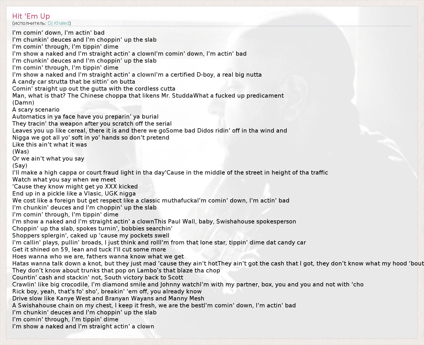 I'm comin' down, I'm actin' bad I'm chunkin' deuces and I'm choppin' up the slab I'm comin' through, I'm tippin' dime I'm show a naked and I'm straight actin' a clownI'm comin' down, I'm actin' bad I'm chunkin' deuces and I'm choppin' up the slab I'm comin' through, I'm tippin' dime I'm show a naked and I'm straight actin' a clownI'm a certified D-boy, a real big nutta A candy car strutta that be sittin' on butta Comin' straight up out the gutta with the cordless cutta Man, what is that? The Chinese choppa that likens Mr. StuddaWhat a fucked up predicament (Damn) A scary scenario Automatics in ya face have you preparin' ya burial They tracin' tha weapon after you scratch off the serial Leaves you up like cereal, there it is and there we goSome bad Didos ridin' off in tha wind and Nigga we got all yo' soft in yo' hands so don't pretend Like this ain't what it was (Was) Or we ain't what you say (Say) I'll make a high cappa or court fraud light in tha day'Cause in the middle of the street in height of tha traffic Watch what you say when we meet 'Cause they know might get yo XXX kicked End up in a pickle like a Vlasic, UGK nigga We cost like a foreign but get respect like a classic muthafuckaI'm comin' down, I'm actin' bad I'm chunkin' deuces and I'm choppin' up the slab I'm comin' through, I'm tippin' dime I'm show a naked and I'm straight actin' a clownThis Paul Wall, baby, Swishahouse spokesperson Choppin' up tha slab, spokes turnin', bobbies searchin' Shoppers splergin', caked up 'cause my pockets swell I'm callin' plays, pullin' broads, I just think and rollI'm from that lone star, tippin' dime dat candy car Get it shined on 59, lean and tuck I'll cut some more Hoes wanna who we are, fathers wanna know what we get Hatas wanna talk down a knot, but they just mad 'cause they ain't hotThey ain't got the cash that I got, they don't know what my hood 'bout They don't know about trunks that pop on Lambo's that blaze tha chop Countin' cash and stackin' not, South victory back to Scott Crawlin' like big crocodile, I'm diamond smile and Johnny watchI'm with my partner, box, you and you and not with 'cho Rick boy, yeah, that's fo' sho', breakin' 'em off, you already know Drive slow like Kanye West and Branyan Wayans and Manny Mesh A Swishahouse chain on my chest, I keep it fresh, we are the bestI'm comin' down, I'm actin' bad I'm chunkin' deuces and I'm choppin' up the slab I'm comin' through, I'm tippin' dime I'm show a naked and I'm straight actin' a clown