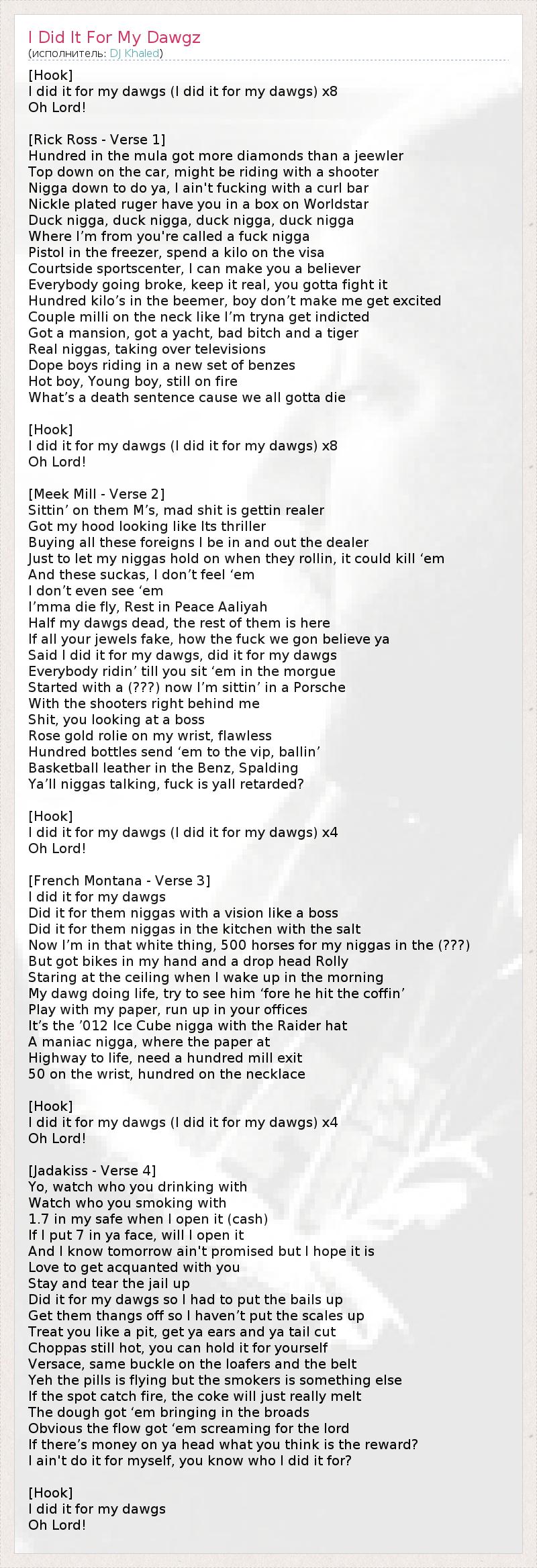 [Hook] I did it for my dawgs (I did it for my dawgs) x8 Oh Lord! [Rick Ross - Verse 1] Hundred in the mula got more diamonds than a jeewler Top down on the car, might be riding with a shooter Nigga down to do ya, I ain't fucking with a curl bar Nickle plated ruger have you in a box on Worldstar Duck nigga, duck nigga, duck nigga, duck nigga Where I’m from you're called a fuck nigga Pistol in the freezer, spend a kilo on the visa Courtside sportscenter, I can make you a believer Everybody going broke, keep it real, you gotta fight it Hundred kilo’s in the beemer, boy don’t make me get excited Couple milli on the neck like I’m tryna get indicted Got a mansion, got a yacht, bad bitch and a tiger Real niggas, taking over televisions Dope boys riding in a new set of benzes Hot boy, Young boy, still on fire What’s a death sentence cause we all gotta die [Hook] I did it for my dawgs (I did it for my dawgs) x8 Oh Lord! [Meek Mill - Verse 2] Sittin’ on them M’s, mad shit is gettin realer Got my hood looking like Its thriller Buying all these foreigns I be in and out the dealer Just to let my niggas hold on when they rollin, it could kill ‘em And these suckas, I don’t feel ‘em I don’t even see ‘em I’mma die fly, Rest in Peace Aaliyah Half my dawgs dead, the rest of them is here If all your jewels fake, how the fuck we gon believe ya Said I did it for my dawgs, did it for my dawgs Everybody ridin’ till you sit ‘em in the morgue Started with a (???) now I’m sittin’ in a Porsche With the shooters right behind me Shit, you looking at a boss Rose gold rolie on my wrist, flawless Hundred bottles send ‘em to the vip, ballin’ Basketball leather in the Benz, Spalding Ya’ll niggas talking, fuck is yall retarded? [Hook] I did it for my dawgs (I did it for my dawgs) x4 Oh Lord! [French Montana - Verse 3] I did it for my dawgs Did it for them niggas with a vision like a boss Did it for them niggas in the kitchen with the salt Now I’m in that white thing, 500 horses for my niggas in the (???) But got bikes in my hand and a drop head Rolly Staring at the ceiling when I wake up in the morning My dawg doing life, try to see him ‘fore he hit the coffin’ Play with my paper, run up in your offices It’s the ’012 Ice Cube nigga with the Raider hat A maniac nigga, where the paper at Highway to life, need a hundred mill exit 50 on the wrist, hundred on the necklace [Hook] I did it for my dawgs (I did it for my dawgs) x4 Oh Lord! [Jadakiss - Verse 4] Yo, watch who you drinking with Watch who you smoking with 1.7 in my safe when I open it (cash) If I put 7 in ya face, will I open it And I know tomorrow ain't promised but I hope it is Love to get acquanted with you Stay and tear the jail up Did it for my dawgs so I had to put the bails up Get them thangs off so I haven’t put the scales up Treat you like a pit, get ya ears and ya tail cut Choppas still hot, you can hold it for yourself Versace, same buckle on the loafers and the belt Yeh the pills is flying but the smokers is something else If the spot catch fire, the coke will just really melt The dough got ‘em bringing in the broads Obvious the flow got ‘em screaming for the lord If there’s money on ya head what you think is the reward? I ain't do it for myself, you know who I did it for? [Hook] I did it for my dawgs Oh Lord!