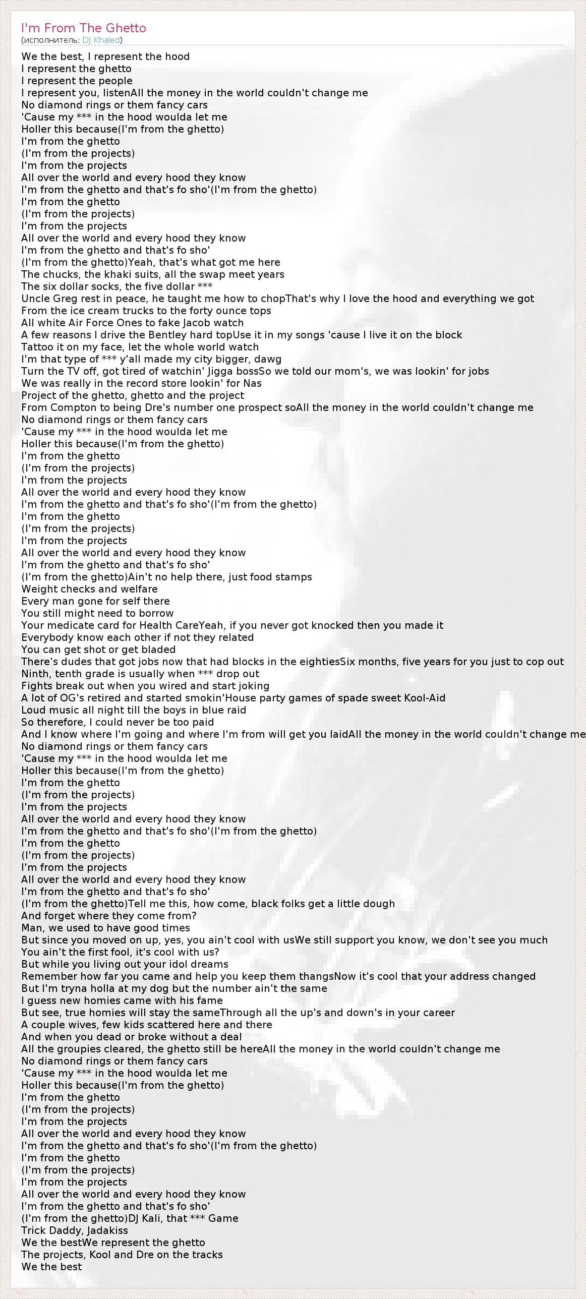 We the best, I represent the hood I represent the ghetto I represent the people I represent you, listenAll the money in the world couldn't change me No diamond rings or them fancy cars 'Cause my *** in the hood woulda let me Holler this because(I'm from the ghetto) I'm from the ghetto (I'm from the projects) I'm from the projects All over the world and every hood they know I'm from the ghetto and that's fo sho'(I'm from the ghetto) I'm from the ghetto (I'm from the projects) I'm from the projects All over the world and every hood they know I'm from the ghetto and that's fo sho' (I'm from the ghetto)Yeah, that's what got me here The chucks, the khaki suits, all the swap meet years The six dollar socks, the five dollar *** Uncle Greg rest in peace, he taught me how to chopThat's why I love the hood and everything we got From the ice cream trucks to the forty ounce tops All white Air Force Ones to fake Jacob watch A few reasons I drive the Bentley hard topUse it in my songs 'cause I live it on the block Tattoo it on my face, let the whole world watch I'm that type of *** y'all made my city bigger, dawg Turn the TV off, got tired of watchin' Jigga bossSo we told our mom's, we was lookin' for jobs We was really in the record store lookin' for Nas Project of the ghetto, ghetto and the project From Compton to being Dre's number one prospect soAll the money in the world couldn't change me No diamond rings or them fancy cars 'Cause my *** in the hood woulda let me Holler this because(I'm from the ghetto) I'm from the ghetto (I'm from the projects) I'm from the projects All over the world and every hood they know I'm from the ghetto and that's fo sho'(I'm from the ghetto) I'm from the ghetto (I'm from the projects) I'm from the projects All over the world and every hood they know I'm from the ghetto and that's fo sho' (I'm from the ghetto)Ain't no help there, just food stamps Weight checks and welfare Every man gone for self there You still might need to borrow Your medicate card for Health CareYeah, if you never got knocked then you made it Everybody know each other if not they related You can get shot or get bladed There's dudes that got jobs now that had blocks in the eightiesSix months, five years for you just to cop out Ninth, tenth grade is usually when *** drop out Fights break out when you wired and start joking A lot of OG's retired and started smokin'House party games of spade sweet Kool-Aid Loud music all night till the boys in blue raid So therefore, I could never be too paid And I know where I'm going and where I'm from will get you laidAll the money in the world couldn't change me No diamond rings or them fancy cars 'Cause my *** in the hood woulda let me Holler this because(I'm from the ghetto) I'm from the ghetto (I'm from the projects) I'm from the projects All over the world and every hood they know I'm from the ghetto and that's fo sho'(I'm from the ghetto) I'm from the ghetto (I'm from the projects) I'm from the projects All over the world and every hood they know I'm from the ghetto and that's fo sho' (I'm from the ghetto)Tell me this, how come, black folks get a little dough And forget where they come from? Man, we used to have good times But since you moved on up, yes, you ain't cool with usWe still support you know, we don't see you much You ain't the first fool, it's cool with us? But while you living out your idol dreams Remember how far you came and help you keep them thangsNow it's cool that your address changed But I'm tryna holla at my dog but the number ain't the same I guess new homies came with his fame But see, true homies will stay the sameThrough all the up's and down's in your career A couple wives, few kids scattered here and there And when you dead or broke without a deal All the groupies cleared, the ghetto still be hereAll the money in the world couldn't change me No diamond rings or them fancy cars 'Cause my *** in the hood woulda let me Holler this because(I'm from the ghetto) I'm from the ghetto (I'm from the projects) I'm from the projects All over the world and every hood they know I'm from the ghetto and that's fo sho'(I'm from the ghetto) I'm from the ghetto (I'm from the projects) I'm from the projects All over the world and every hood they know I'm from the ghetto and that's fo sho' (I'm from the ghetto)DJ Kali, that *** Game Trick Daddy, Jadakiss We the bestWe represent the ghetto The projects, Kool and Dre on the tracks We the best