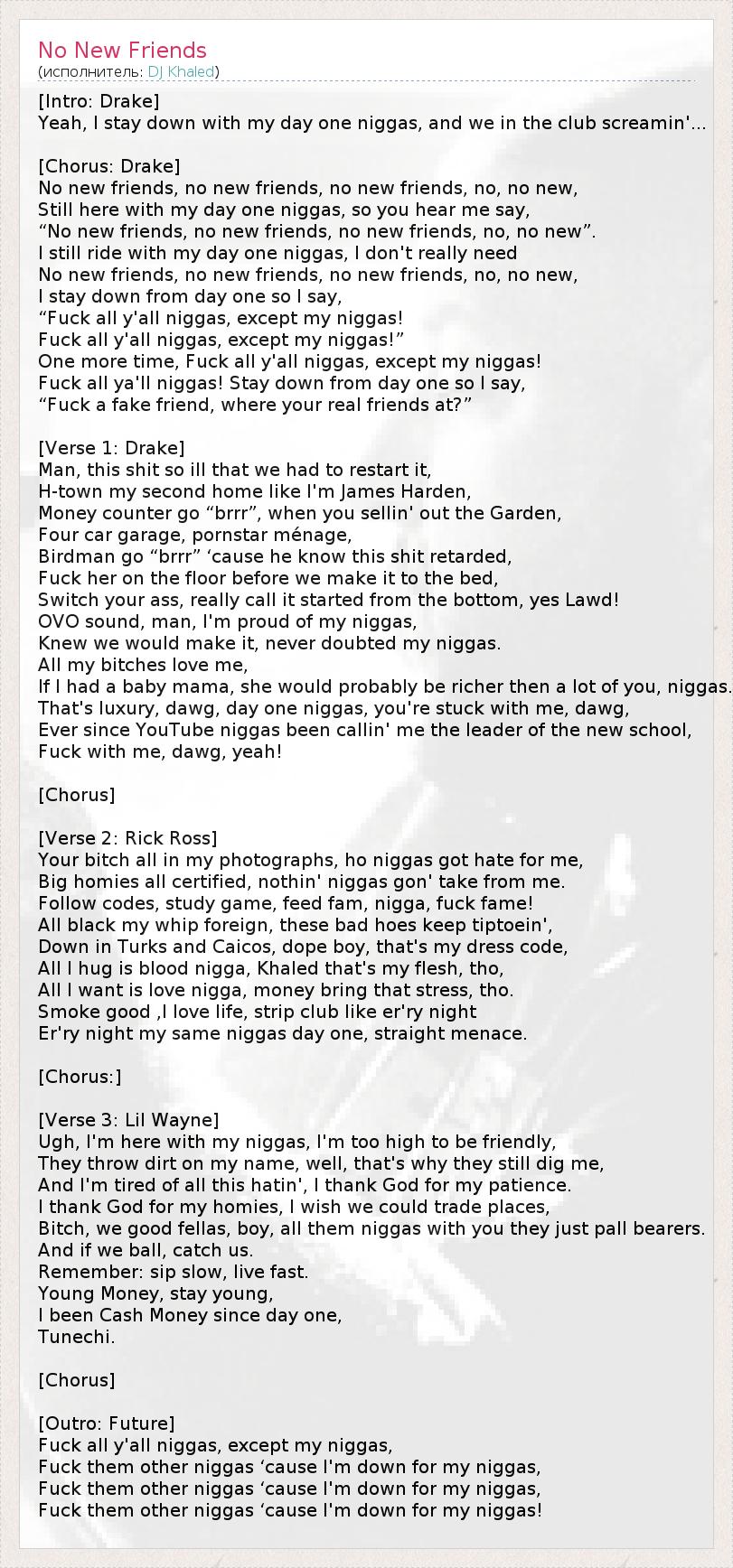 [Intro: Drake] Yeah, I stay down with my day one niggas, and we in the club screamin'... [Chorus: Drake] No new friends, no new friends, no new friends, no, no new, Still here with my day one niggas, so you hear me say, “No new friends, no new friends, no new friends, no, no new”. I still ride with my day one niggas, I don't really need No new friends, no new friends, no new friends, no, no new, I stay down from day one so I say, “Fuck all y'all niggas, except my niggas! Fuck all y'all niggas, except my niggas!” One more time, Fuck all y'all niggas, except my niggas! Fuck all ya'll niggas! Stay down from day one so I say, “Fuck a fake friend, where your real friends at?” [Verse 1: Drake] Man, this shit so ill that we had to restart it, H-town my second home like I'm James Harden, Money counter go “brrr”, when you sellin' out the Garden, Four car garage, pornstar ménage, Birdman go “brrr” ‘cause he know this shit retarded, Fuck her on the floor before we make it to the bed, Switch your ass, really call it started from the bottom, yes Lawd! OVO sound, man, I'm proud of my niggas, Knew we would make it, never doubted my niggas. All my bitches love me, If I had a baby mama, she would probably be richer then a lot of you, niggas. That's luxury, dawg, day one niggas, you're stuck with me, dawg, Ever since YouTube niggas been callin' me the leader of the new school, Fuck with me, dawg, yeah! [Chorus] [Verse 2: Rick Ross] Your bitch all in my photographs, ho niggas got hate for me, Big homies all certified, nothin' niggas gon' take from me. Follow codes, study game, feed fam, nigga, fuck fame! All black my whip foreign, these bad hoes keep tiptoein', Down in Turks and Caicos, dope boy, that's my dress code, All I hug is blood nigga, Khaled that's my flesh, tho, All I want is love nigga, money bring that stress, tho. Smoke good ,I love life, strip club like er'ry night Er'ry night my same niggas day one, straight menace. [Chorus:] [Verse 3: Lil Wayne] Ugh, I'm here with my niggas, I'm too high to be friendly, They throw dirt on my name, well, that's why they still dig me, And I'm tired of all this hatin', I thank God for my patience. I thank God for my homies, I wish we could trade places, Bitch, we good fellas, boy, all them niggas with you they just pall bearers. And if we ball, catch us. Remember: sip slow, live fast. Young Money, stay young, I been Cash Money since day one, Tunechi. [Chorus] [Outro: Future] Fuck all y'all niggas, except my niggas, Fuck them other niggas ‘cause I'm down for my niggas, Fuck them other niggas ‘cause I'm down for my niggas, Fuck them other niggas ‘cause I'm down for my niggas!