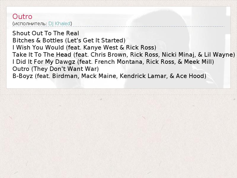Это интересно:Dj Khaled родился в Новом Орлеане, штат Луизиана . Он имеет палестинские корни и живет в Пемброк Пайнс Ознакомившись с треклистами двух альбомов DJ Khaled, есть риск поймать себя на желании навесить на него ярлык главного жулика и халявщика современного хип-хопа" - на обеих пластинках всего 3 песни с его продакшном. При этом он не читает рэп и не поет – впору трясти чеком и требовать сатисфакции.... продолжение