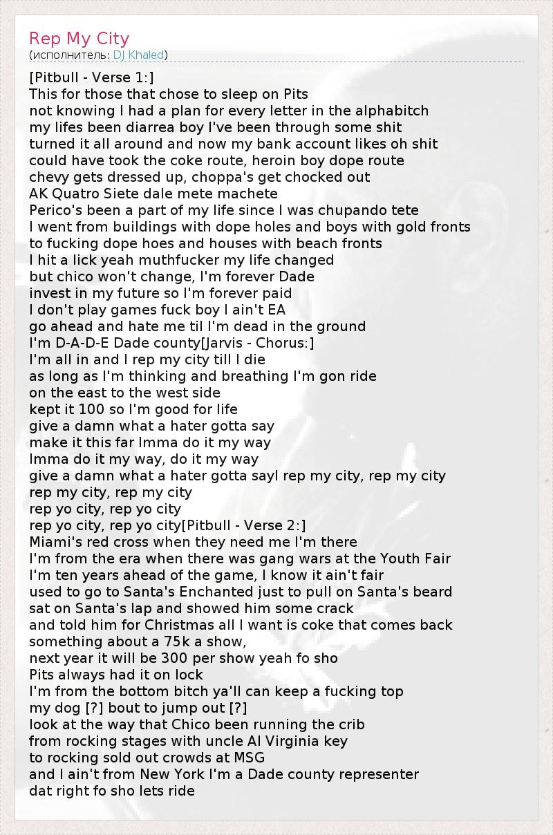 [Pitbull - Verse 1:] This for those that chose to sleep on Pits not knowing I had a plan for every letter in the alphabitch my lifes been diarrea boy I've been through some shit turned it all around and now my bank account likes oh shit could have took the coke route, heroin boy dope route chevy gets dressed up, choppa's get chocked out AK Quatro Siete dale mete machete Perico's been a part of my life since I was chupando tete I went from buildings with dope holes and boys with gold fronts to fucking dope hoes and houses with beach fronts I hit a lick yeah muthfucker my life changed but chico won't change, I'm forever Dade invest in my future so I'm forever paid I don't play games fuck boy I ain't EA go ahead and hate me til I'm dead in the ground I'm D-A-D-E Dade county[Jarvis - Chorus:] I'm all in and I rep my city till I die as long as I'm thinking and breathing I'm gon ride on the east to the west side kept it 100 so I'm good for life give a damn what a hater gotta say make it this far Imma do it my way Imma do it my way, do it my way give a damn what a hater gotta sayI rep my city, rep my city rep my city, rep my city rep yo city, rep yo city rep yo city, rep yo city[Pitbull - Verse 2:] Miami's red cross when they need me I'm there I'm from the era when there was gang wars at the Youth Fair I'm ten years ahead of the game, I know it ain't fair used to go to Santa's Enchanted just to pull on Santa's beard sat on Santa's lap and showed him some crack and told him for Christmas all I want is coke that comes back something about a 75k a show, next year it will be 300 per show yeah fo sho Pits always had it on lock I'm from the bottom bitch ya'll can keep a fucking top my dog [?] bout to jump out [?] look at the way that Chico been running the crib from rocking stages with uncle Al Virginia key to rocking sold out crowds at MSG and I ain't from New York I'm a Dade county representer dat right fo sho lets ride
