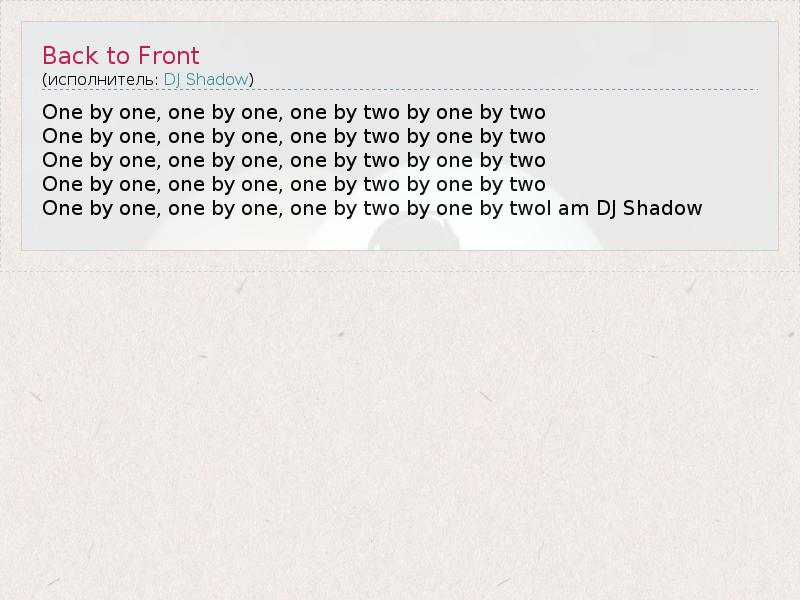 One by one, one by one, one by two by one by twoI am DJ Shadow
