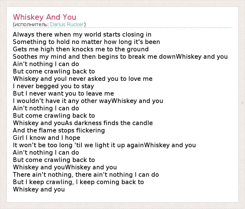Always there when my world starts closing in Something to hold no matter how long it's been Gets me high then knocks me to the ground Soothes my mind and then begins to break me downWhiskey and you Ain't nothing I can do But come crawling back to Whiskey and youI never asked you to love me I never begged you to stay But I never want you to leave me I wouldn't have it any other wayWhiskey and you Ain't nothing I can do But come crawling back to Whiskey and youAs darkness finds the candle And the flame stops flickering Girl I know and I hope It won't be too long 'til we light it up againWhiskey and you Ain't nothing I can do But come crawling back to Whiskey and youWhiskey and you There ain't nothing, there ain't nothing I can do But I keep crawling, I keep coming back to Whiskey and you