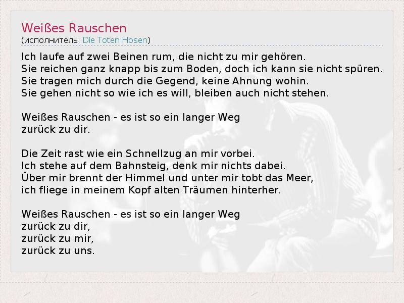 Ich laufe Auf Zwei Beinen ром, умирают Nicht Zu Mir gehören . Sie Reichen Ганц Кнапп бис Zum Боден , Дочь Ich Канн Sie Nicht Spuren . Sie Tragen Мичиган Durch умереть Gegend , KEINE Ahnung Wohin . Sie gehen Nicht так Wie ич ES будет, bleiben Ош Nicht stehen . Weißes Rauschen - ES IST так Эйн Лангер Weg zurück цу реж. Die Zeit Раст Wie Эйн Schnellzug в Vorbei Мир . Ich stehe Auf Dem Bahnsteig , DENK Мир Nichts Дабэй . Убер мир Brennt дер HIMMEL унд Унтер Мир tobt дас Meer , Ich Fliege в meinem Kopf Alten Träumen hinterher . Weißes Rauschen - ES IST так Эйн Лангер Weg zurück цу Дир, zurück цу мир, zurück Zu UNS .