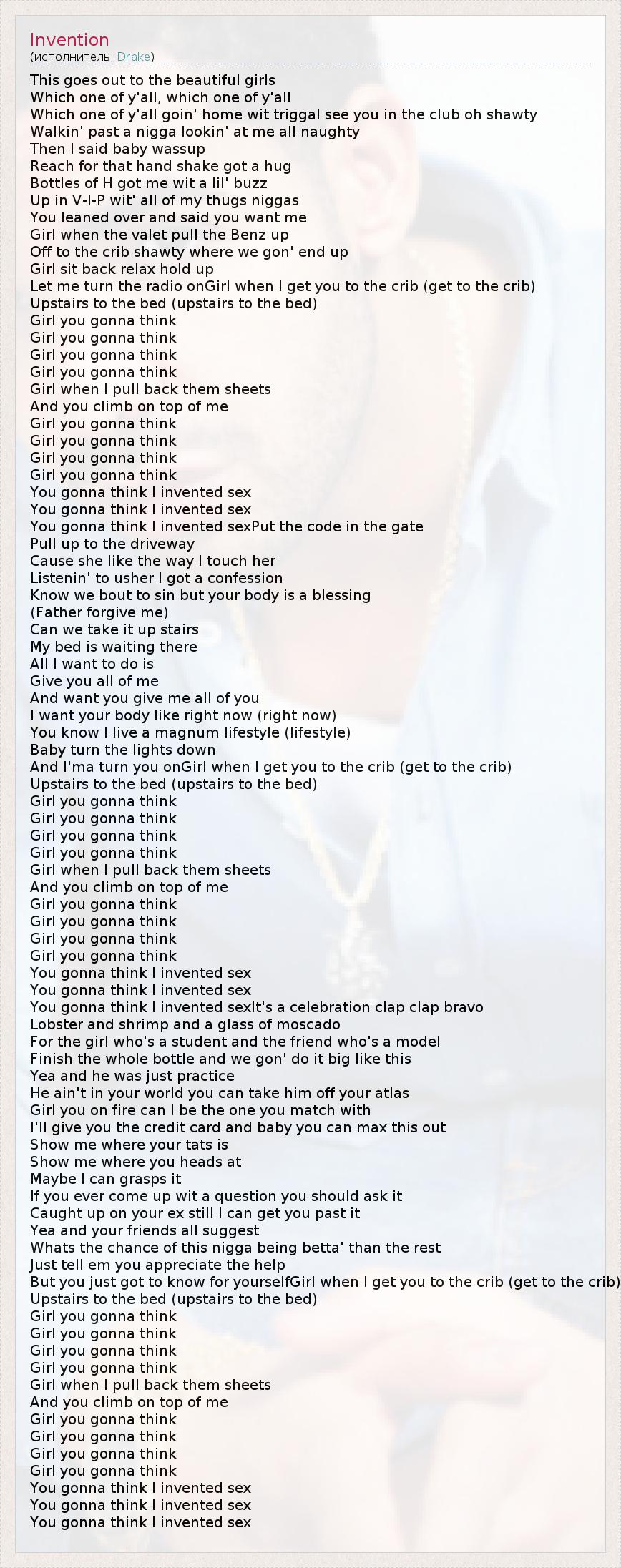 This goes out to the beautiful girls Which one of y'all, which one of y'all Which one of y'all goin' home wit triggaI see you in the club oh shawty Walkin' past a nigga lookin' at me all naughty Then I said baby wassup Reach for that hand shake got a hug Bottles of H got me wit a lil' buzz Up in V-I-P wit' all of my thugs niggas You leaned over and said you want me Girl when the valet pull the Benz up Off to the crib shawty where we gon' end up Girl sit back relax hold up Let me turn the radio onGirl when I get you to the crib (get to the crib) Upstairs to the bed (upstairs to the bed) Girl you gonna think Girl you gonna think Girl you gonna think Girl you gonna think Girl when I pull back them sheets And you climb on top of me Girl you gonna think Girl you gonna think Girl you gonna think Girl you gonna think You gonna think I invented sex You gonna think I invented sex You gonna think I invented sexPut the code in the gate Pull up to the driveway Cause she like the way I touch her Listenin' to usher I got a confession Know we bout to sin but your body is a blessing (Father forgive me) Can we take it up stairs My bed is waiting there All I want to do is Give you all of me And want you give me all of you I want your body like right now (right now) You know I live a magnum lifestyle (lifestyle) Baby turn the lights down And I'ma turn you onGirl when I get you to the crib (get to the crib) Upstairs to the bed (upstairs to the bed) Girl you gonna think Girl you gonna think Girl you gonna think Girl you gonna think Girl when I pull back them sheets And you climb on top of me Girl you gonna think Girl you gonna think Girl you gonna think Girl you gonna think You gonna think I invented sex You gonna think I invented sex You gonna think I invented sexIt's a celebration clap clap bravo Lobster and shrimp and a glass of moscado For the girl who's a student and the friend who's a model Finish the whole bottle and we gon' do it big like this Yea and he was just practice He ain't in your world you can take him off your atlas Girl you on fire can I be the one you match with I'll give you the credit card and baby you can max this out Show me where your tats is Show me where you heads at Maybe I can grasps it If you ever come up wit a question you should ask it Caught up on your ex still I can get you past it Yea and your friends all suggest Whats the chance of this nigga being betta' than the rest Just tell em you appreciate the help But you just got to know for yourselfGirl when I get you to the crib (get to the crib) Upstairs to the bed (upstairs to the bed) Girl you gonna think Girl you gonna think Girl you gonna think Girl you gonna think Girl when I pull back them sheets And you climb on top of me Girl you gonna think Girl you gonna think Girl you gonna think Girl you gonna think You gonna think I invented sex You gonna think I invented sex You gonna think I invented sex