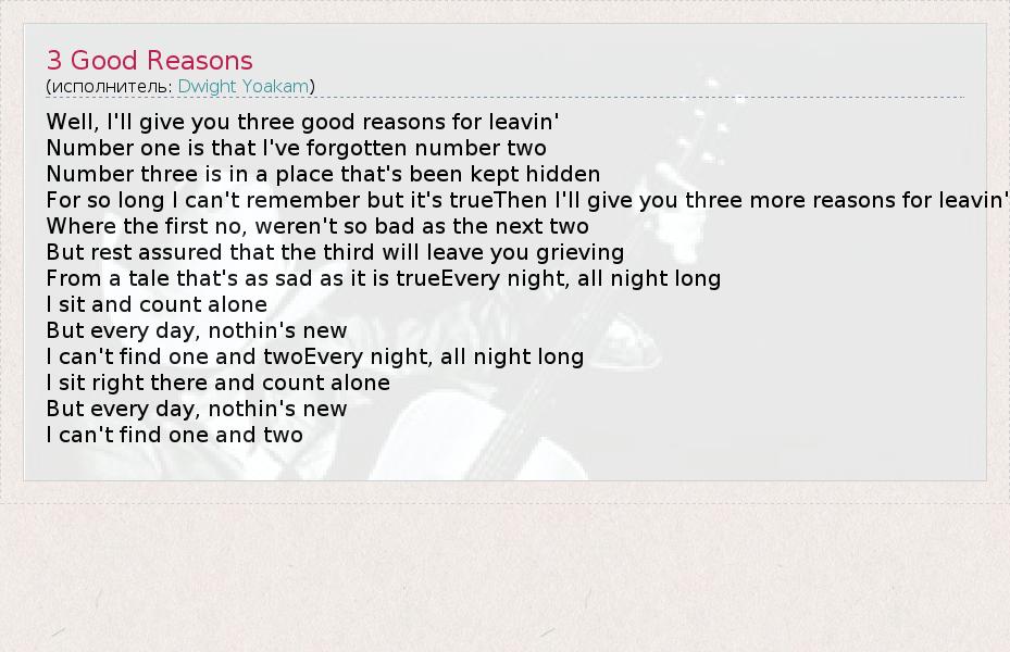 А как ты думаешь, о чем песня "3 Good Reasons" ?