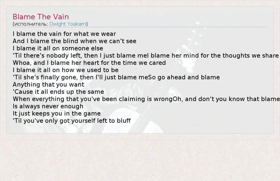 I blame the vain for what we wear And I blame the blind when we can't see I blame it all on someone else 'Til there's nobody left, then I just blame meI blame her mind for the thoughts we share Whoa, and I blame her heart for the time we cared I blame it all on how we used to be 'Til she's finally gone, then I'll just blame meSo go ahead and blame Anything that you want 'Cause it all ends up the same When everything that you've been claiming is wrongOh, and don't you know that blame Is always never enough It just keeps you in the game 'Til you've only got yourself left to bluff