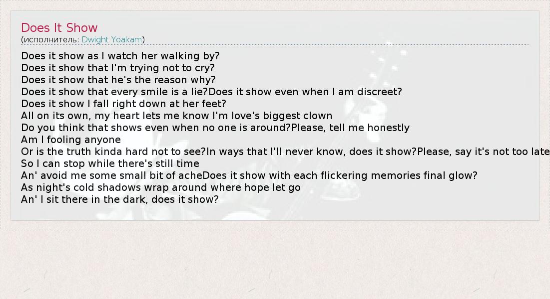 Does it show as I watch her walking by? Does it show that I'm trying not to cry? Does it show that he's the reason why? Does it show that every smile is a lie?Does it show even when I am discreet? Does it show I fall right down at her feet? All on its own, my heart lets me know I'm love's biggest clown Do you think that shows even when no one is around?Please, tell me honestly Am I fooling anyone Or is the truth kinda hard not to see?In ways that I'll never know, does it show?Please, say it's not too late So I can stop while there's still time An' avoid me some small bit of acheDoes it show with each flickering memories final glow? As night's cold shadows wrap around where hope let go An' I sit there in the dark, does it show?