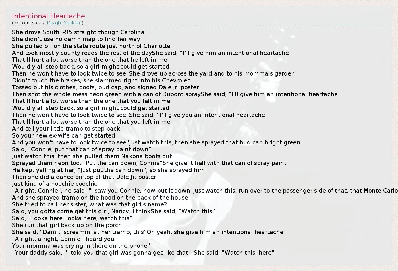 She drove South I-95 straight though Carolina She didn't use no damn map to find her way She pulled off on the state route just north of Charlotte And took mostly county roads the rest of the dayShe said, "I'll give him an intentional heartache That'll hurt a lot worse than the one that he left in me Would y'all step back, so a girl might could get started Then he won't have to look twice to see"She drove up across the yard and to his momma's garden Didn't touch the brakes, she slammed right into his Chevrolet Tossed out his clothes, boots, bud cap, and signed Dale Jr. poster Then shot the whole mess neon green with a can of Dupont sprayShe said, "I'll give him an intentional heartache That'll hurt a lot worse than the one that you left in me Would y'all step back, so a girl might could get started Then he won't have to look twice to see"She said, "I'll give you an intentional heartache That'll hurt a lot worse than the one that you left in me And tell your little tramp to step back So your new ex-wife can get started And you won't have to look twice to see"Just watch this, then she sprayed that bud cap bright green Said, "Connie, put that can of spray paint down" Just watch this, then she pulled them Nakona boots out Sprayed them neon too, "Put the can down, Connie"She give it hell with that can of spray paint He kept yelling at her, "Just put the can down", so she sprayed him Then she did a dance on top of that Dale Jr. poster Just kind of a hoochie coochie "Alright, Connie", he said, "I saw you Connie, now put it down"Just watch this, run over to the passenger side of that, that Monte Carlo And she sprayed tramp on the hood on the back of the house She tried to call her sister, what was that girl's name? Said, you gotta come get this girl, Nancy, I thinkShe said, "Watch this" Said, "Looka here, looka here, watch this" She run that girl back up on the porch She said, "Damit, screamin' at her tramp, this"Oh yeah, she give him an intentional heartache "Alright, alright, Connie I heard you Your momma was crying in there on the phone" "Your daddy said, "I told you that girl was gonna get like that""She said, "Watch this, here"