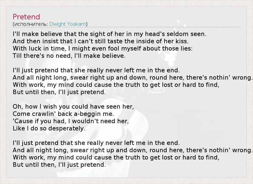 I'll make believe that the sight of her in my head's seldom seen. And then insist that I can't still taste the inside of her kiss. With luck in time, I might even fool myself about those lies: Till there's no need, I'll make believe. I'll just pretend that she really never left me in the end. And all night long, swear right up and down, round here, there's nothin' wrong. With work, my mind could cause the truth to get lost or hard to find, But until then, I'll just pretend. Oh, how I wish you could have seen her, Come crawlin' back a-beggin me. 'Cause if you had, I wouldn't need her, Like I do so desperately. I'll just pretend that she really never left me in the end. And all night long, swear right up and down, round here, there's nothin' wrong. With work, my mind could cause the truth to get lost or hard to find, But until then, I'll just pretend.
