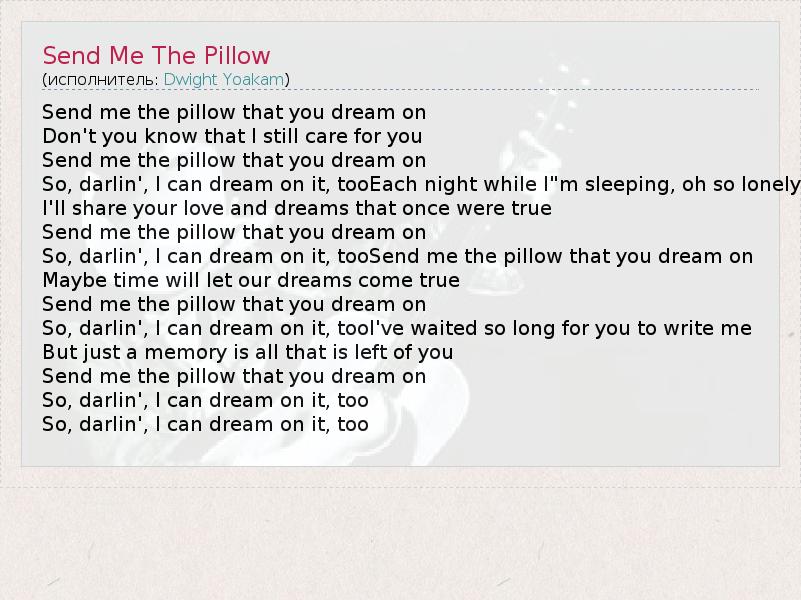 Send me the pillow that you dream on Don't you know that I still care for you Send me the pillow that you dream on So, darlin', I can dream on it, tooEach night while I"m sleeping, oh so lonely I'll share your love and dreams that once were true Send me the pillow that you dream on So, darlin', I can dream on it, tooSend me the pillow that you dream on Maybe time will let our dreams come true Send me the pillow that you dream on So, darlin', I can dream on it, tooI've waited so long for you to write me But just a memory is all that is left of you Send me the pillow that you dream on So, darlin', I can dream on it, too So, darlin', I can dream on it, too