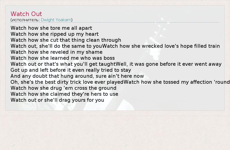 Watch how she tore me all apart Watch how she ripped up my heart Watch how she cut that thing clean through Watch out, she'll do the same to youWatch how she wrecked love's hope filled train Watch how she reveled in my shame Watch how she learned me who was boss Watch out or that's what you'll get taughtWell, it was gone before it ever went away Got up and left before it even really tried to stay And any doubt that hung around, sure ain't here now Oh, she's the best dirty trick love ever playedWatch how she tossed my affection 'round Watch how she drug 'em cross the ground Watch how she claimed they're hers to use Watch out or she'll drag yours for you