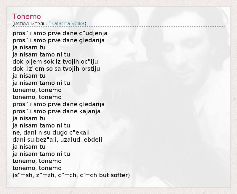 pros"li smo prve dane c"udjenja pros"li smo prve dane gledanja ja nisam tu ja nisam tamo ni tu dok pijem sok iz tvojih oc"iju dok liz"em so sa tvojih prstiju ja nisam tu ja nisam tamo ni tu tonemo, tonemo tonemo, tonemo pros"li smo prve dane gledanja pros"li smo prve dane kajanja ja nisam tu ja nisam tamo ni tu ne, dani nisu dugo c"ekali dani su bez"ali, uzalud lebdeli ja nisam tu ja nisam tamo ni tu tonemo, tonemo tonemo, tonemo (s"=sh, z"=zh, c"=ch, c'=ch but softer)