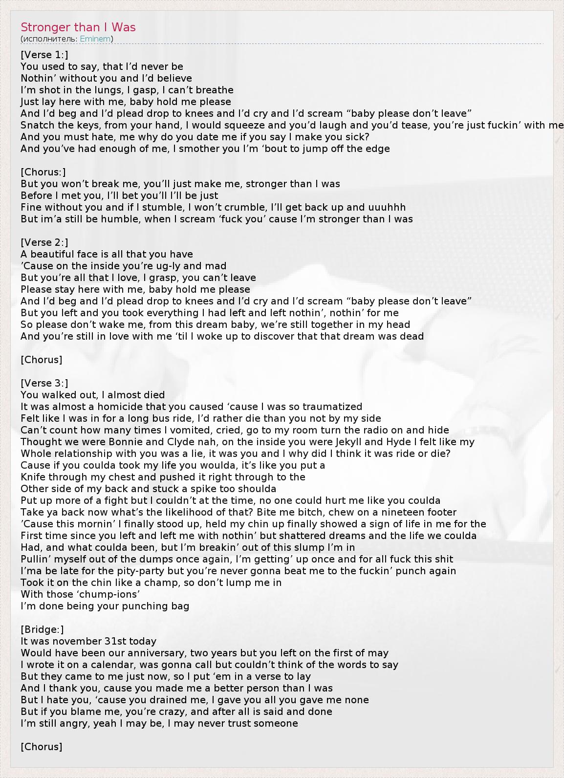 А как ты думаешь, о чем песня "Stronger than I Was" ?