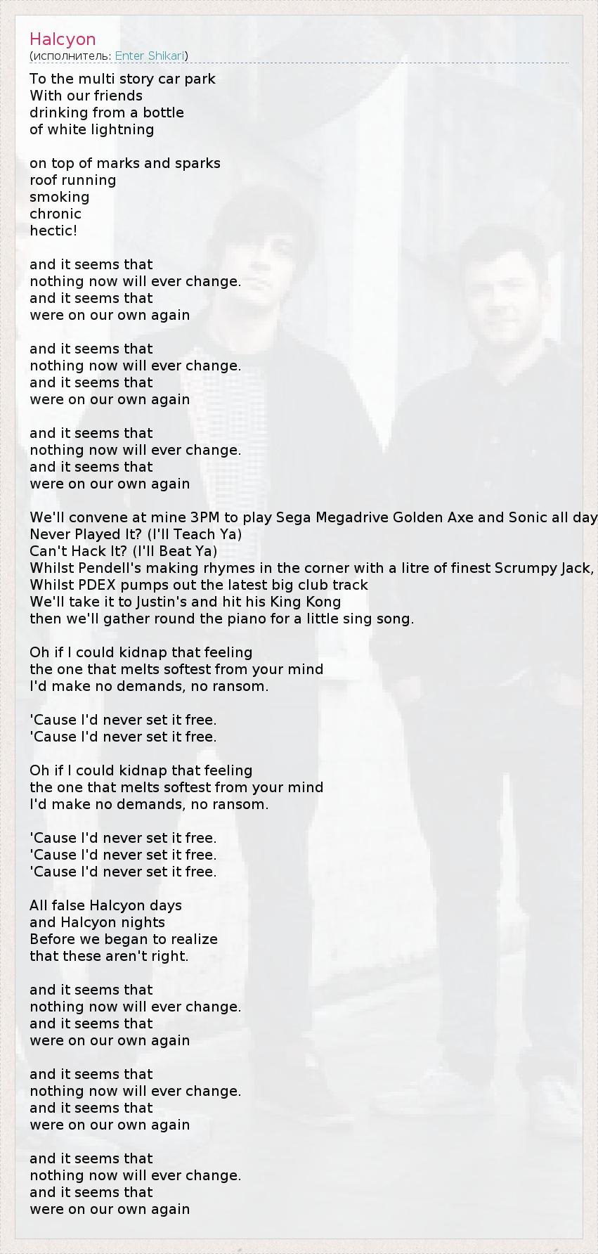 To the multi story car park With our friends drinking from a bottle of white lightning on top of marks and sparks roof running smoking chronic hectic! and it seems that nothing now will ever change. and it seems that were on our own again and it seems that nothing now will ever change. and it seems that were on our own again and it seems that nothing now will ever change. and it seems that were on our own again We'll convene at mine 3PM to play Sega Megadrive Golden Axe and Sonic all day Never Played It? (I'll Teach Ya) Can't Hack It? (I'll Beat Ya) Whilst Pendell's making rhymes in the corner with a litre of finest Scrumpy Jack, Whilst PDEX pumps out the latest big club track We'll take it to Justin's and hit his King Kong then we'll gather round the piano for a little sing song. Oh if I could kidnap that feeling the one that melts softest from your mind I'd make no demands, no ransom. 'Cause I'd never set it free. 'Cause I'd never set it free. Oh if I could kidnap that feeling the one that melts softest from your mind I'd make no demands, no ransom. 'Cause I'd never set it free. 'Cause I'd never set it free. 'Cause I'd never set it free. All false Halcyon days and Halcyon nights Before we began to realize that these aren't right. and it seems that nothing now will ever change. and it seems that were on our own again and it seems that nothing now will ever change. and it seems that were on our own again and it seems that nothing now will ever change. and it seems that were on our own again