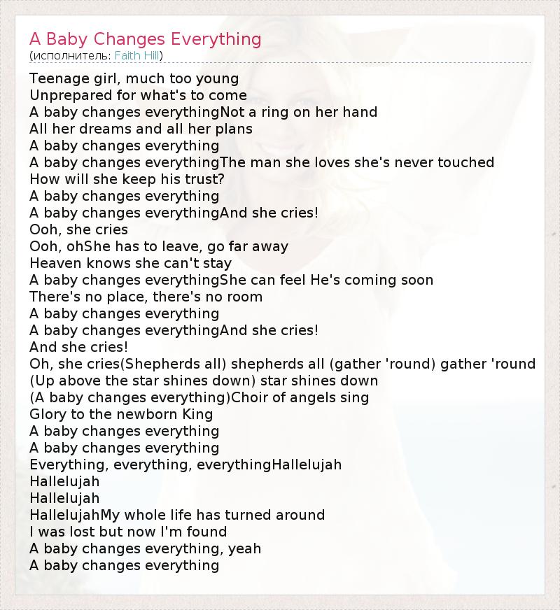 Teenage girl, much too young Unprepared for what's to come A baby changes everythingNot a ring on her hand All her dreams and all her plans A baby changes everything A baby changes everythingThe man she loves she's never touched How will she keep his trust? A baby changes everything A baby changes everythingAnd she cries! Ooh, she cries Ooh, ohShe has to leave, go far away Heaven knows she can't stay A baby changes everythingShe can feel He's coming soon There's no place, there's no room A baby changes everything A baby changes everythingAnd she cries! And she cries! Oh, she cries(Shepherds all) shepherds all (gather 'round) gather 'round (Up above the star shines down) star shines down (A baby changes everything)Choir of angels sing Glory to the newborn King A baby changes everything A baby changes everything Everything, everything, everythingHallelujah Hallelujah Hallelujah HallelujahMy whole life has turned around I was lost but now I'm found A baby changes everything, yeah A baby changes everything