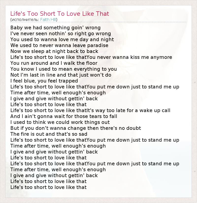 Baby we had something goin' wrong I've never seen nothin' so right go wrong You used to wanna love me day and night We used to never wanna leave paradise Now we sleep at night back to back Life's too short to love like thatYou never wanna kiss me anymore You run around and I walk the floor You know I used to mean everything to you Not I'm last in line and that just won't do I feel blue, you feel trapped Life's too short to love like thatYou put me down just to stand me up Time after time, well enough's enough I give and give without gettin' back Life's too short to love like that Life's too short to love like thatIt's way too late for a wake up call And I ain't gonna wait for those tears to fall I used to think we could work things out But if you don't wanna change then there's no doubt The fire is out and that's so sad Life's too short to love like thatYou put me down just to stand me up Time after time, well enough's enough I give and give without gettin' back Life's too short to love like that Life's too short to love like thatYou put me down just to stand me up Time after time, well enough's enough I give and give without gettin' back Life's too short to love like that Life's too short to love like that