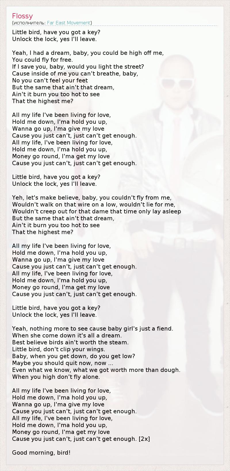 Птичка, у тебя есть ключ? Открой замок, и я уйду. Е-а, у меня была мечта, детка, ты могла бы быть высоко от меня, Ты могла летать свободно. Если я спасу тебя, детка, ты осветишь эту улицу? Ведь внутри меня ты не можешь дышать, детка, Нет, ты не чувствуешь своих ног, Но то, о чем ты не мечтаешь, Ведь оно жжет тебя слишком горячо, чтобы увидеть Что-то возвышенное во мне... Всю свою жизнь я жил ради любви, Держи меня, и я не отпущу тебя, Я хочу подняться вверх, я подарю свою любовь, Потому что тебе просто мало, тебе просто мало. Всю свою жизнь я жил ради любви, Держи меня, и я не отпущу тебя, Деньги крутятся, я получу свою любовь, Потому что тебе просто мало, тебе просто мало. Птичка, у тебя есть ключ? Открой замок, и я уйду. Е, давай представим, детка, что ты не сможешь улететь от меня, Не будешь гулять по жердочке внизу, не будешь лгать мне, Не будешь пугать эту женщину, когда она только ляжет спать... Но то, о чем ты не мечтаешь, Ведь оно жжет тебя слишком горячо, чтобы увидеть Что-то возвышенное во мне... Всю свою жизнь я жил ради любви, Держи меня, и я не отпущу тебя, Я хочу подняться вверх, я подарю свою любовь, Потому что тебе просто мало, тебе просто мало. Всю свою жизнь я жил ради любви, Держи меня, и я не отпущу тебя, Деньги вертятся, я получу свою любовь, Потому что тебе просто мало, тебе просто мало. Птичка, у тебя есть ключ? Открой замок, и я уйду. Е-а, больше нечего выяснять, ведь моя детка – просто жертва. Когда она спускается – это просто мечта. Лучше поверь, из-за птичек не стоит злиться. Птичка, смотри, чтоб тебе не подрезали крылья. Детка, когда ты опускаешься, ты не падаешь? Может быть, тебе надо улететь сейчас, сейчас... Даже то, что мы знаем и что имеем, дороже денег. Когда ты поднимаешься ввысь, не летай одна. Всю свою жизнь я жил ради любви, Держи меня, и я не отпущу тебя, Я хочу подняться вверх, я подарю свою любовь, Потому что тебе просто мало, тебе просто мало. Всю свою жизнь я жил ради любви, Держи меня, и я не отпущу тебя, Деньги вертятся, я получу свою любовь, Потому что тебе просто мало, тебе просто мало. [2x] Доброе утро, птичка!