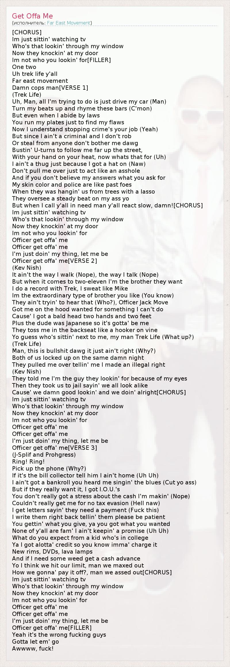 [CHORUS] Im just sittin' watching tv Who's that lookin' through my window Now they knockin' at my door Im not who you lookin' for[FILLER] One two Uh trek life y'all Far east movement Damn cops man[VERSE 1] (Trek Life) Uh, Man, all I'm trying to do is just drive my car (Man) Turn my beats up and rhyme these bars (C'mon) But even when I abide by laws You run my plates just to find my flaws Now I understand stopping crime's your job (Yeah) But since I ain't a criminal and I don't rob Or steal from anyone don't bother me dawg Bustin' U-turns to follow me far up the street, With your hand on your heat, now whats that for (Uh) I ain't a thug just because I got a hat on (Naw) Don't pull me over just to act like an asshole And if you don't believe my answers what you ask for My skin color and police are like past foes When they was hangin' us from trees with a lasso They oversee a steady beat on my ass yo But when I call y'all in need man y'all react slow, damn![CHORUS] Im just sittin' watching tv Who's that lookin' through my window Now they knockin' at my door Im not who you lookin' for Officer get offa' me Officer get offa' me I'm just doin' my thing, let me be Officer get offa' me[VERSE 2] (Kev Nish) It ain't the way I walk (Nope), the way I talk (Nope) But when it comes to two-eleven I'm the brother they want I do a record with Trek, I sweat like Mike Im the extraordinary type of brother you like (You know) They ain't tryin' to hear that (Who?), Officer Jack Move Got me on the hood wanted for something I can't do Cause' I got a bald head two hands and two feet Plus the dude was Japanese so it's gotta' be me They toss me in the backseat like a hooker on vine Yo guess who's sittin' next to me, my man Trek Life (What up?) (Trek Life) Man, this is bullshit dawg it just ain't right (Why?) Both of us locked up on the same damn night They pulled me over tellin' me I made an illegal right (Kev Nish) They told me I'm the guy they lookin' for because of my eyes Then they took us to jail sayin' we all look alike Cause' we damn good lookin' and we doin' alright[CHORUS] Im just sittin' watching tv Who's that lookin' through my window Now they knockin' at my door Im not who you lookin' for Officer get offa' me Officer get offa' me I'm just doin' my thing, let me be Officer get offa' me[VERSE 3] (J-Splif and Prohgress) Ring! Ring! Pick up the phone (Why?) If it's the bill collector tell him I ain't home (Uh Uh) I ain't got a bankroll you heard me singin' the blues (Cut yo ass) But if they really want it, I got I.O.U.'s You don't really got a stress about the cash I'm makin' (Nope) Couldn't really get me for no tax evasion (Hell naw) I get letters sayin' they need a payment (Fuck this) I write them right back tellin' them please be patient You gettin' what you give, ya you got what you wanted None of y'all are fam' I ain't keepin' a promise (Uh Uh) What do you expect from a kid who's in college Ya I got alotta' credit so you know imma' charge it New rims, DVDs, lava lamps And if I need some weed get a cash advance Yo I think we hit our limit, man we maxed out How we gonna' pay it off?, man we assed out[CHORUS] Im just sittin' watching tv Who's that lookin' through my window Now they knockin' at my door Im not who you lookin' for Officer get offa' me Officer get offa' me I'm just doin' my thing, let me be Officer get offa' me[FILLER] Yeah it's the wrong fucking guys Gotta let em' go Awwww, fuck!