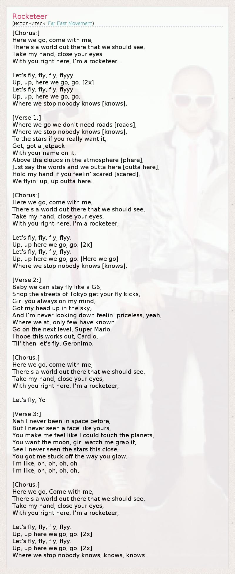 [Chorus:] Here we go, come with me, There's a world out there that we should see, Take my hand, close your eyes With you right here, I'm a rocketeer... Let's fly, fly, fly, flyyy. Up, up, here we go, go. [2x] Let's fly, fly, fly, flyyy. Up, up, here we go, go. Where we stop nobody knows [knows], [Verse 1:] Where we go we don't need roads [roads], Where we stop nobody knows [knows], To the stars if you really want it, Got, got a jetpack With your name on it, Above the clouds in the atmosphere [phere], Just say the words and we outta here [outta here], Hold my hand if you feelin' scared [scared], We flyin' up, up outta here. [Chorus:] Here we go, come with me, There's a world out there that we should see, Take my hand, close your eyes, With you right here, I'm a rocketeer, Let's fly, fly, fly, flyy. Up, up here we go, go. [2x] Let's fly, fly, fly, flyy. Up, up here we go, go. [Here we go] Where we stop nobody knows [knows], [Verse 2:] Baby we can stay fly like a G6, Shop the streets of Tokyo get your fly kicks, Girl you always on my mind, Got my head up in the sky, And I'm never looking down feelin' priceless, yeah, Where we at, only few have known Go on the next level, Super Mario I hope this works out, Cardio, Til' then let's fly, Geronimo. [Chorus:] Here we go, come with me, There's a world out there that we should see, Take my hand, close your eyes, With you right here, I'm a rocketeer, Let's fly, Yo [Verse 3:] Nah I never been in space before, But I never seen a face like yours, You make me feel like I could touch the planets, You want the moon, girl watch me grab it, See I never seen the stars this close, You got me stuck off the way you glow, I'm like, oh, oh, oh, oh I'm like, oh, oh, oh, oh, [Chorus:] Here we go, Come with me, There's a world out there that we should see, Take my hand, close your eyes, With you right here, I'm a rocketeer, Let's fly, fly, fly, flyy. Up, up here we go, go. [2x] Let's fly, fly, fly, flyy. Up, up here we go, go. [2x] Where we stop nobody knows, knows, knows.