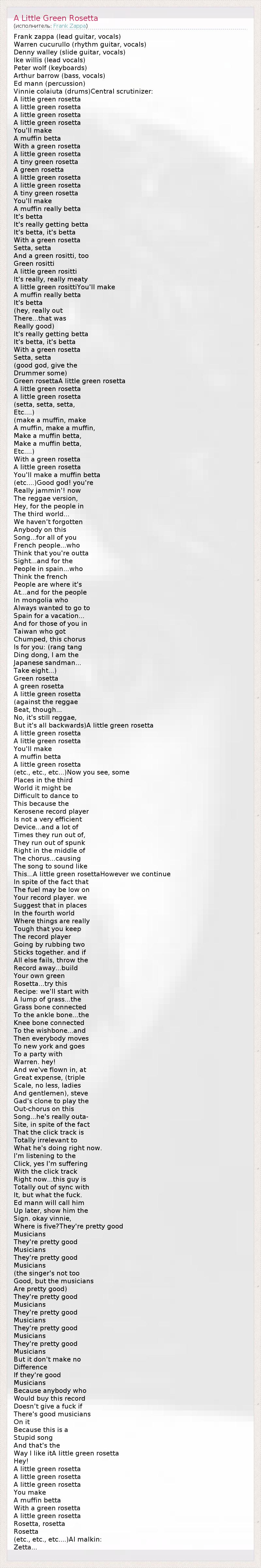 Frank zappa (lead guitar, vocals) Warren cucurullo (rhythm guitar, vocals) Denny walley (slide guitar, vocals) Ike willis (lead vocals) Peter wolf (keyboards) Arthur barrow (bass, vocals) Ed mann (percussion) Vinnie colaiuta (drums)Central scrutinizer: A little green rosetta A little green rosetta A little green rosetta A little green rosetta You'll make A muffin betta With a green rosetta A little green rosetta A tiny green rosetta A green rosetta A little green rosetta A little green rosetta A tiny green rosetta You'll make A muffin really betta It's betta It's really getting betta It's betta, it's betta With a green rosetta Setta, setta And a green rositti, too Green rositti A little green rositti It's really, really meaty A little green rosittiYou'll make A muffin really betta It's betta (hey, really out There...that was Really good) It's really getting betta It's betta, it's betta With a green rosetta Setta, setta (good god, give the Drummer some) Green rosettaA little green rosetta A little green rosetta A little green rosetta (setta, setta, setta, Etc....) (make a muffin, make A muffin, make a muffin, Make a muffin betta, Make a muffin betta, Etc....) With a green rosetta A little green rosetta You'll make a muffin betta (etc....)Good god! you're Really jammin'! now The reggae version, Hey, for the people in The third world... We haven't forgotten Anybody on this Song...for all of you French people...who Think that you're outta Sight...and for the People in spain...who Think the french People are where it's At...and for the people In mongolia who Always wanted to go to Spain for a vacation... And for those of you in Taiwan who got Chumped, this chorus Is for you: (rang tang Ding dong, I am the Japanese sandman... Take eight...) Green rosetta A green rosetta A little green rosetta (against the reggae Beat, though... No, it's still reggae, But it's all backwards)A little green rosetta A little green rosetta A little green rosetta You'll make A muffin betta A little green rosetta (etc., etc., etc...)Now you see, some Places in the third World it might be Difficult to dance to This because the Kerosene record player Is not a very efficient Device...and a lot of Times they run out of, They run out of spunk Right in the middle of The chorus...causing The song to sound like This...A little green rosettaHowever we continue In spite of the fact that The fuel may be low on Your record player. we Suggest that in places In the fourth world Where things are really Tough that you keep The record player Going by rubbing two Sticks together. and if All else fails, throw the Record away...build Your own green Rosetta...try this Recipe: we'll start with A lump of grass...the Grass bone connected To the ankle bone...the Knee bone connected To the wishbone...and Then everybody moves To new york and goes To a party with Warren. hey! And we've flown in, at Great expense, (triple Scale, no less, ladies And gentlemen), steve Gad's clone to play the Out-chorus on this Song...he's really outa- Site, in spite of the fact That the click track is Totally irrelevant to What he's doing right now. I'm listening to the Click, yes I'm suffering With the click track Right now...this guy is Totally out of sync with It, but what the fuck. Ed mann will call him Up later, show him the Sign. okay vinnie, Where is five?They're pretty good Musicians They're pretty good Musicians They're pretty good Musicians (the singer's not too Good, but the musicians Are pretty good) They're pretty good Musicians They're pretty good Musicians They're pretty good Musicians They're pretty good Musicians But it don't make no Difference If they're good Musicians Because anybody who Would buy this record Doesn't give a fuck if There's good musicians On it Because this is a Stupid song And that's the Way I like itA little green rosetta Hey! A little green rosetta A little green rosetta A little green rosetta You make A muffin betta With a green rosetta A little green rosetta Rosetta, rosetta Rosetta (etc., etc., etc....)Al malkin: Zetta...