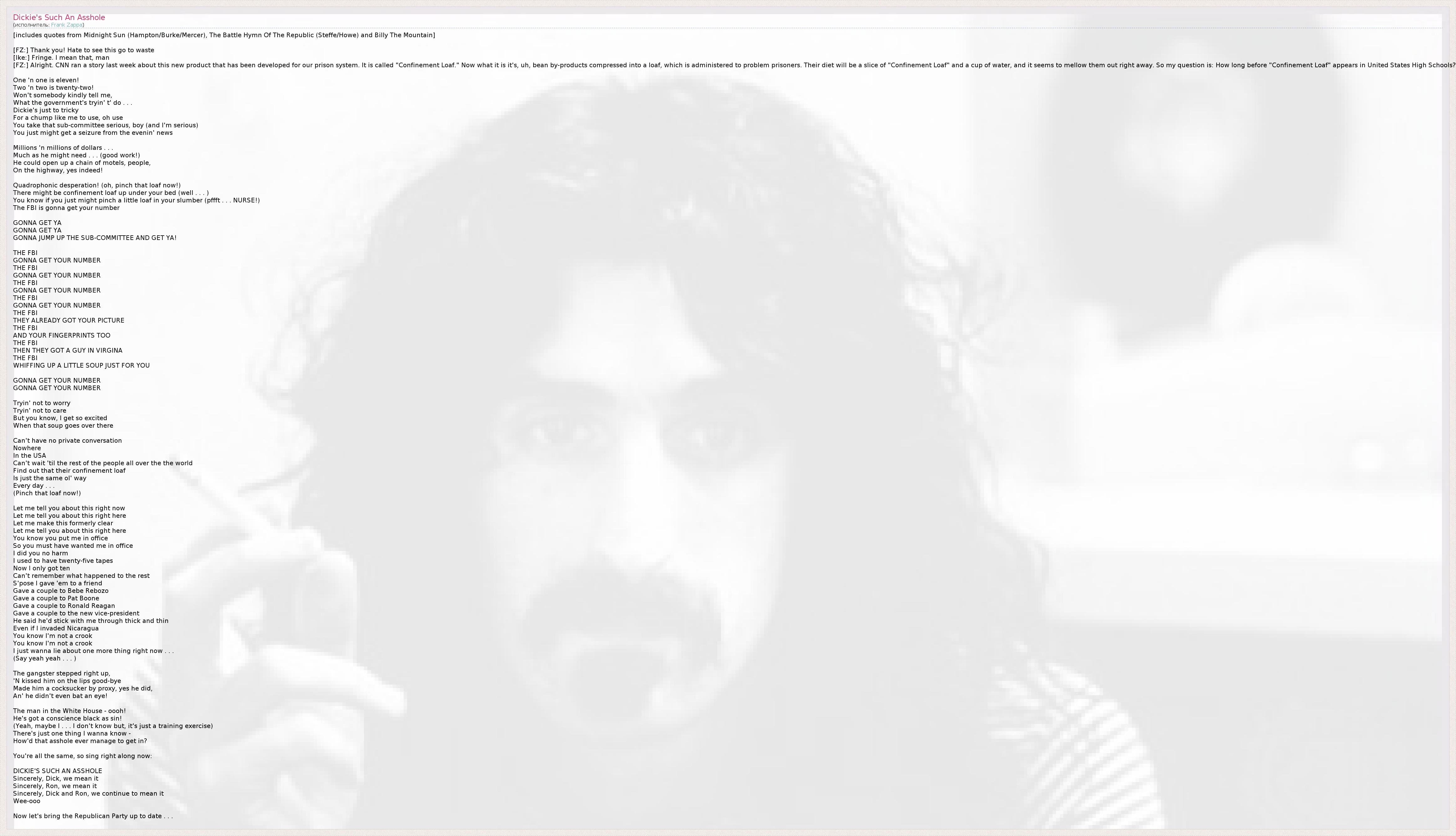 [includes quotes from Midnight Sun (Hampton/Burke/Mercer), The Battle Hymn Of The Republic (Steffe/Howe) and Billy The Mountain] [FZ:] Thank you! Hate to see this go to waste [Ike:] Fringe. I mean that, man [FZ:] Alright. CNN ran a story last week about this new product that has been developed for our prison system. It is called "Confinement Loaf." Now what it is it's, uh, bean by-products compressed into a loaf, which is administered to problem prisoners. Their diet will be a slice of "Confinement Loaf" and a cup of water, and it seems to mellow them out right away. So my question is: How long before "Confinement Loaf" appears in United States High Schools? One 'n one is eleven! Two 'n two is twenty-two! Won't somebody kindly tell me, What the government's tryin' t' do . . . Dickie's just to tricky For a chump like me to use, oh use You take that sub-committee serious, boy (and I'm serious) You just might get a seizure from the evenin' news Millions 'n millions of dollars . . . Much as he might need . . . (good work!) He could open up a chain of motels, people, On the highway, yes indeed! Quadrophonic desperation! (oh, pinch that loaf now!) There might be confinement loaf up under your bed (well . . . ) You know if you just might pinch a little loaf in your slumber (pffft . . . NURSE!) The FBI is gonna get your number GONNA GET YA GONNA GET YA GONNA JUMP UP THE SUB-COMMITTEE AND GET YA! THE FBI GONNA GET YOUR NUMBER THE FBI GONNA GET YOUR NUMBER THE FBI GONNA GET YOUR NUMBER THE FBI GONNA GET YOUR NUMBER THE FBI THEY ALREADY GOT YOUR PICTURE THE FBI AND YOUR FINGERPRINTS TOO THE FBI THEN THEY GOT A GUY IN VIRGINA THE FBI WHIFFING UP A LITTLE SOUP JUST FOR YOU GONNA GET YOUR NUMBER GONNA GET YOUR NUMBER Tryin' not to worry Tryin' not to care But you know, I get so excited When that soup goes over there Can't have no private conversation Nowhere In the USA Can't wait 'til the rest of the people all over the the world Find out that their confinement loaf Is just the same ol' way Every day . . . (Pinch that loaf now!) Let me tell you about this right now Let me tell you about this right here Let me make this formerly clear Let me tell you about this right here You know you put me in office So you must have wanted me in office I did you no harm I used to have twenty-five tapes Now I only got ten Can't remember what happened to the rest S'pose I gave 'em to a friend Gave a couple to Bebe Rebozo Gave a couple to Pat Boone Gave a couple to Ronald Reagan Gave a couple to the new vice-president He said he'd stick with me through thick and thin Even if I invaded Nicaragua You know I'm not a crook You know I'm not a crook I just wanna lie about one more thing right now . . . (Say yeah yeah . . . ) The gangster stepped right up, 'N kissed him on the lips good-bye Made him a cocksucker by proxy, yes he did, An' he didn't even bat an eye! The man in the White House - oooh! He's got a conscience black as sin! (Yeah, maybe I . . . I don't know but, it's just a training exercise) There's just one thing I wanna know - How'd that asshole ever manage to get in? You're all the same, so sing right along now: DICKIE'S SUCH AN ASSHOLE Sincerely, Dick, we mean it Sincerely, Ron, we mean it Sincerely, Dick and Ron, we continue to mean it Wee-ooo Now let's bring the Republican Party up to date . . .