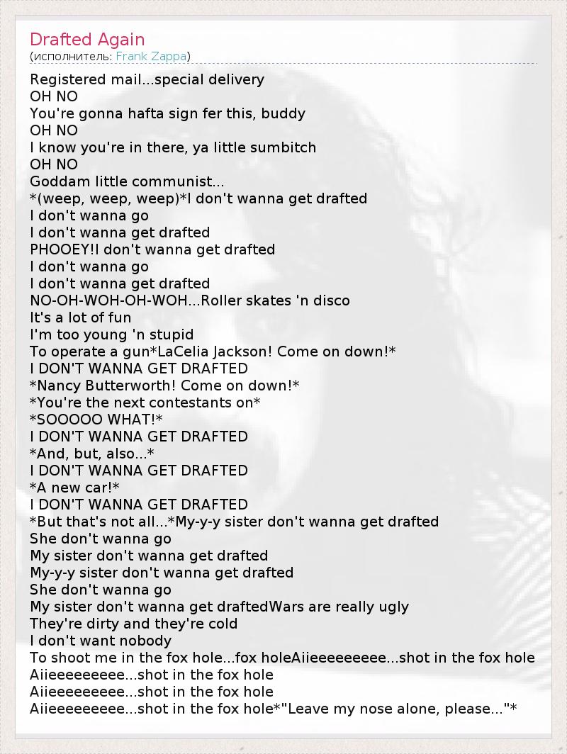 Registered mail...special delivery OH NO You're gonna hafta sign fer this, buddy OH NO I know you're in there, ya little sumbitch OH NO Goddam little communist... *(weep, weep, weep)*I don't wanna get drafted I don't wanna go I don't wanna get drafted PHOOEY!I don't wanna get drafted I don't wanna go I don't wanna get drafted NO-OH-WOH-OH-WOH...Roller skates 'n disco It's a lot of fun I'm too young 'n stupid To operate a gun*LaCelia Jackson! Come on down!* I DON'T WANNA GET DRAFTED *Nancy Butterworth! Come on down!* *You're the next contestants on* *SOOOOO WHAT!* I DON'T WANNA GET DRAFTED *And, but, also...* I DON'T WANNA GET DRAFTED *A new car!* I DON'T WANNA GET DRAFTED *But that's not all...*My-y-y sister don't wanna get drafted She don't wanna go My sister don't wanna get drafted My-y-y sister don't wanna get drafted She don't wanna go My sister don't wanna get draftedWars are really ugly They're dirty and they're cold I don't want nobody To shoot me in the fox hole...fox holeAiieeeeeeeee...shot in the fox hole Aiieeeeeeeee...shot in the fox hole Aiieeeeeeeee...shot in the fox hole Aiieeeeeeeee...shot in the fox hole*"Leave my nose alone, please..."*
