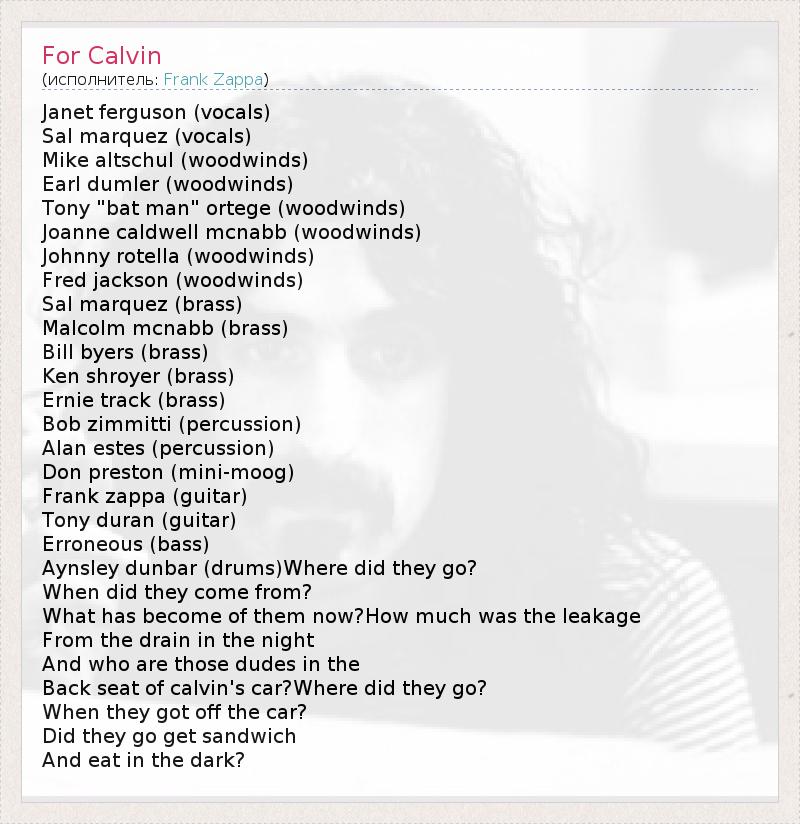 Это интересно:Фрэнк Винсент Заппа (англ. Frank Vincent Zappa, 21 декабря 1940 — 4 декабря 1993) — легендарный американский композитор, гитарист, певец, кинорежиссёр и сатирик. Был руководителем рок-группы The Mothers of Invention. Лауреат премии «Грэмми».За свою 33-летнюю музыкальную карьеру Заппа показал себя одним из самых плодовитых композиторов своей эпохи, выпустив более шестидесяти альбомов, почти все из... продолжение