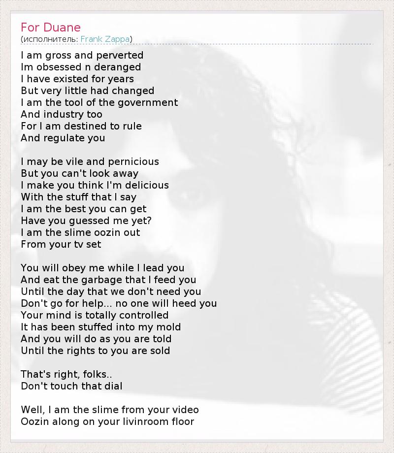 Это интересно:Фрэнк Винсент Заппа (англ. Frank Vincent Zappa, 21 декабря 1940 — 4 декабря 1993) — легендарный американский композитор, гитарист, певец, кинорежиссёр и сатирик. Был руководителем рок-группы The Mothers of Invention. Лауреат премии «Грэмми».За свою 33-летнюю музыкальную карьеру Заппа показал себя одним из самых плодовитых композиторов своей эпохи, выпустив более шестидесяти альбомов, почти все из... продолжение