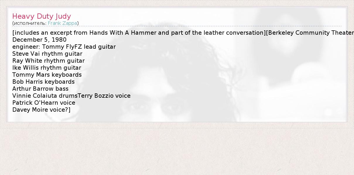Это интересно:Фрэнк Винсент Заппа (англ. Frank Vincent Zappa, 21 декабря 1940 — 4 декабря 1993) — легендарный американский композитор, гитарист, певец, кинорежиссёр и сатирик. Был руководителем рок-группы The Mothers of Invention. Лауреат премии «Грэмми».За свою 33-летнюю музыкальную карьеру Заппа показал себя одним из самых плодовитых композиторов своей эпохи, выпустив более шестидесяти альбомов, почти все из... продолжение