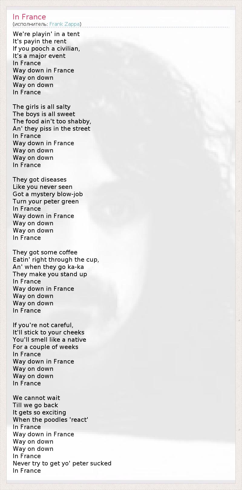 Это интересно:Фрэнк Винсент Заппа (англ. Frank Vincent Zappa, 21 декабря 1940 — 4 декабря 1993) — легендарный американский композитор, гитарист, певец, кинорежиссёр и сатирик. Был руководителем рок-группы The Mothers of Invention. Лауреат премии «Грэмми».За свою 33-летнюю музыкальную карьеру Заппа показал себя одним из самых плодовитых композиторов своей эпохи, выпустив более шестидесяти альбомов, почти все из... продолжение
