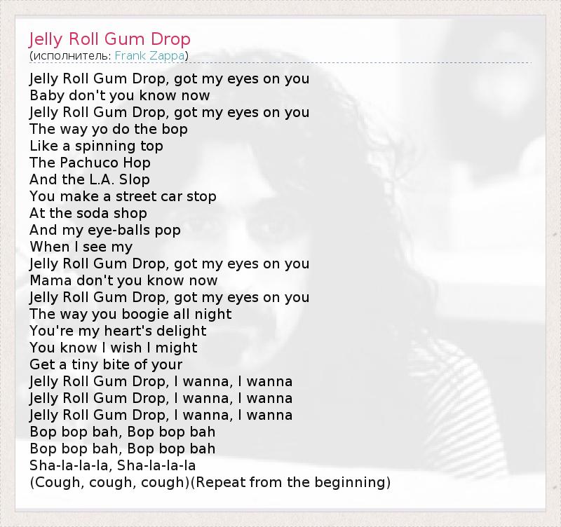 Jelly Roll Gum Drop, got my eyes on you Baby don't you know now Jelly Roll Gum Drop, got my eyes on you The way yo do the bop Like a spinning top The Pachuco Hop And the L.A. Slop You make a street car stop At the soda shop And my eye-balls pop When I see my Jelly Roll Gum Drop, got my eyes on you Mama don't you know now Jelly Roll Gum Drop, got my eyes on you The way you boogie all night You're my heart's delight You know I wish I might Get a tiny bite of your Jelly Roll Gum Drop, I wanna, I wanna Jelly Roll Gum Drop, I wanna, I wanna Jelly Roll Gum Drop, I wanna, I wanna Bop bop bah, Bop bop bah Bop bop bah, Bop bop bah Sha-la-la-la, Sha-la-la-la (Cough, cough, cough)(Repeat from the beginning)