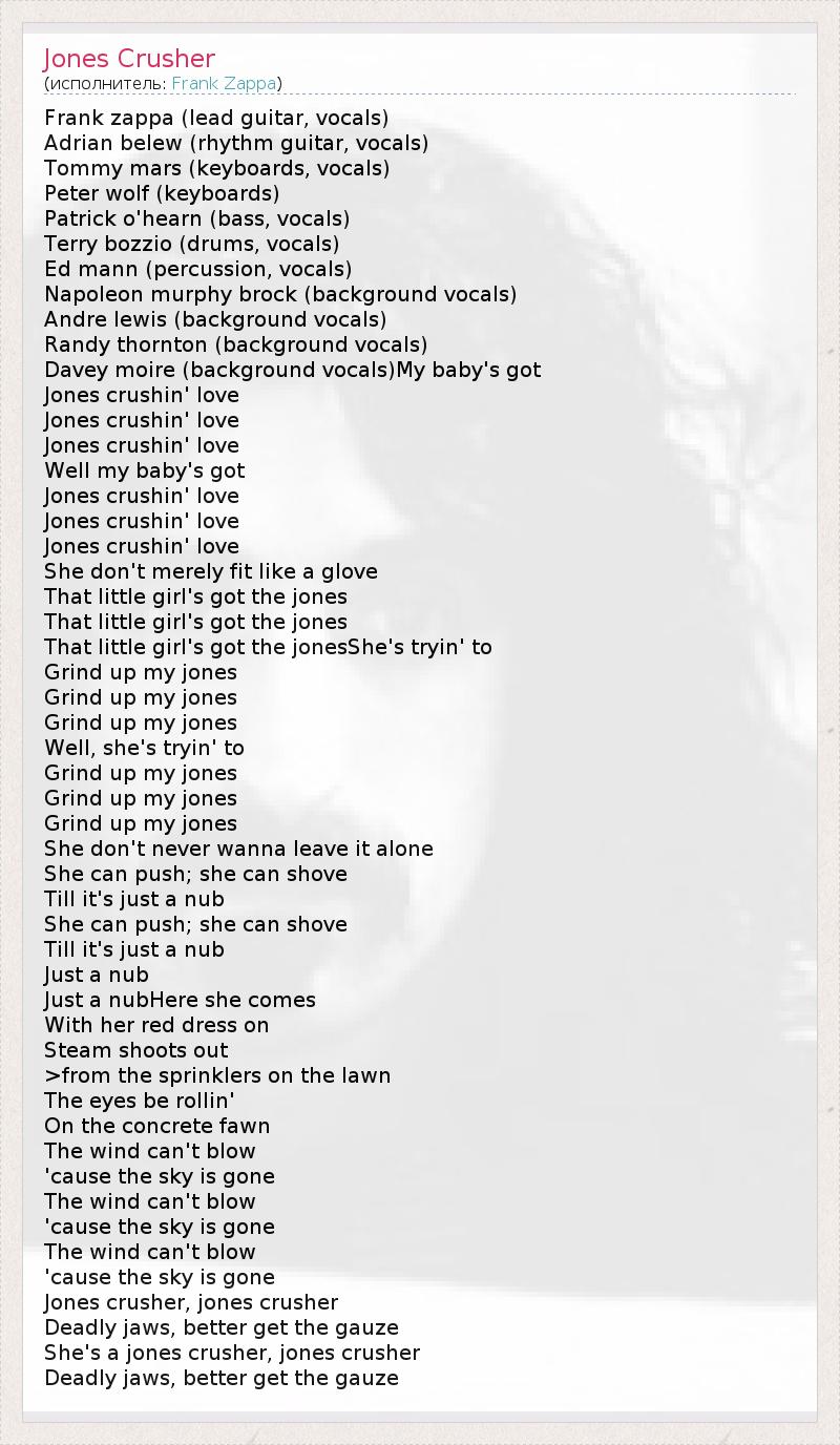 Frank zappa (lead guitar, vocals) Adrian belew (rhythm guitar, vocals) Tommy mars (keyboards, vocals) Peter wolf (keyboards) Patrick o'hearn (bass, vocals) Terry bozzio (drums, vocals) Ed mann (percussion, vocals) Napoleon murphy brock (background vocals) Andre lewis (background vocals) Randy thornton (background vocals) Davey moire (background vocals)My baby's got Jones crushin' love Jones crushin' love Jones crushin' love Well my baby's got Jones crushin' love Jones crushin' love Jones crushin' love She don't merely fit like a glove That little girl's got the jones That little girl's got the jones That little girl's got the jonesShe's tryin' to Grind up my jones Grind up my jones Grind up my jones Well, she's tryin' to Grind up my jones Grind up my jones Grind up my jones She don't never wanna leave it alone She can push; she can shove Till it's just a nub She can push; she can shove Till it's just a nub Just a nub Just a nubHere she comes With her red dress on Steam shoots out >from the sprinklers on the lawn The eyes be rollin' On the concrete fawn The wind can't blow 'cause the sky is gone The wind can't blow 'cause the sky is gone The wind can't blow 'cause the sky is gone Jones crusher, jones crusher Deadly jaws, better get the gauze She's a jones crusher, jones crusher Deadly jaws, better get the gauze