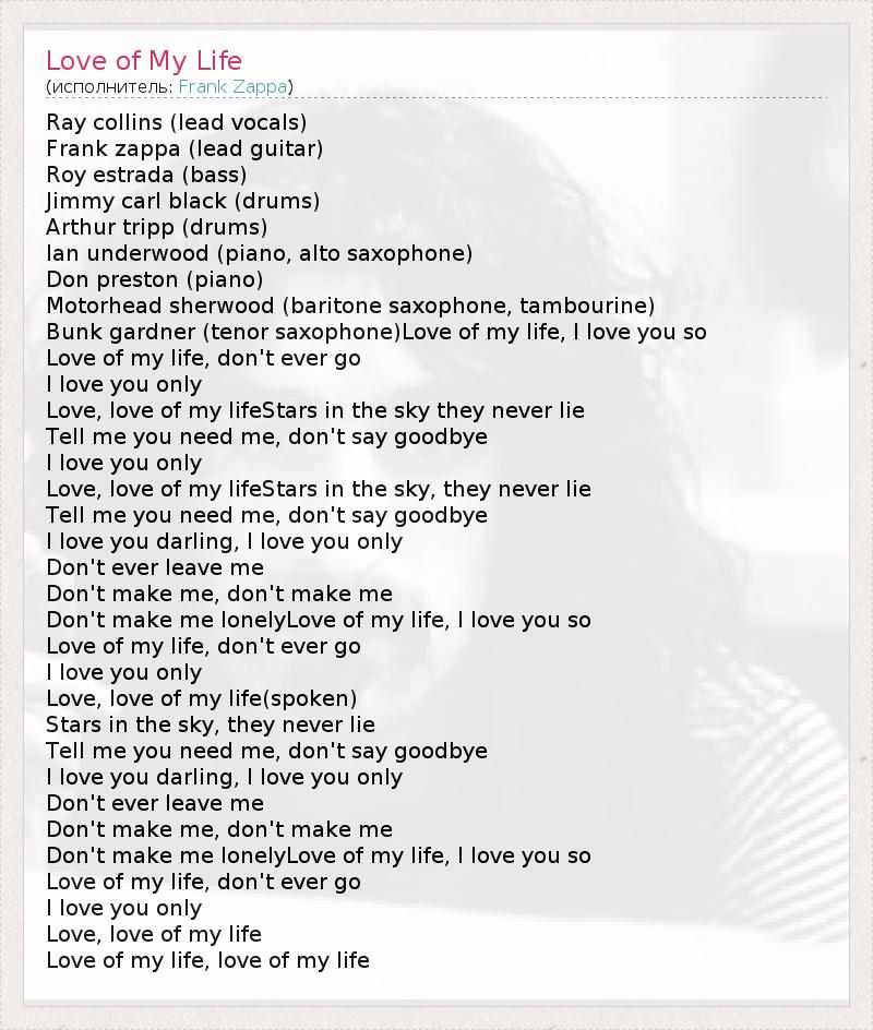 Ray collins (lead vocals) Frank zappa (lead guitar) Roy estrada (bass) Jimmy carl black (drums) Arthur tripp (drums) Ian underwood (piano, alto saxophone) Don preston (piano) Motorhead sherwood (baritone saxophone, tambourine) Bunk gardner (tenor saxophone)Love of my life, I love you so Love of my life, don't ever go I love you only Love, love of my lifeStars in the sky they never lie Tell me you need me, don't say goodbye I love you only Love, love of my lifeStars in the sky, they never lie Tell me you need me, don't say goodbye I love you darling, I love you only Don't ever leave me Don't make me, don't make me Don't make me lonelyLove of my life, I love you so Love of my life, don't ever go I love you only Love, love of my life(spoken) Stars in the sky, they never lie Tell me you need me, don't say goodbye I love you darling, I love you only Don't ever leave me Don't make me, don't make me Don't make me lonelyLove of my life, I love you so Love of my life, don't ever go I love you only Love, love of my life Love of my life, love of my life