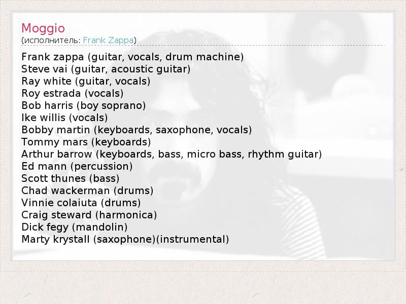 Это интересно:Фрэнк Винсент Заппа (англ. Frank Vincent Zappa, 21 декабря 1940 — 4 декабря 1993) — легендарный американский композитор, гитарист, певец, кинорежиссёр и сатирик. Был руководителем рок-группы The Mothers of Invention. Лауреат премии «Грэмми».За свою 33-летнюю музыкальную карьеру Заппа показал себя одним из самых плодовитых композиторов своей эпохи, выпустив более шестидесяти альбомов, почти все из... продолжение