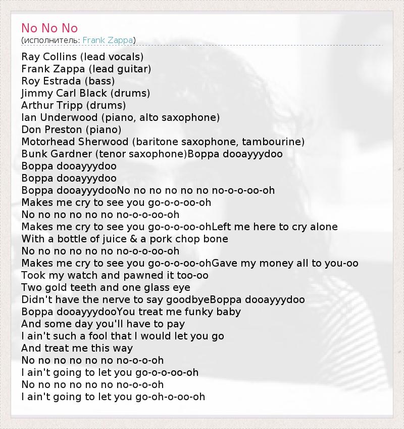 Ray Collins (lead vocals) Frank Zappa (lead guitar) Roy Estrada (bass) Jimmy Carl Black (drums) Arthur Tripp (drums) Ian Underwood (piano, alto saxophone) Don Preston (piano) Motorhead Sherwood (baritone saxophone, tambourine) Bunk Gardner (tenor saxophone)Boppa dooayyydoo Boppa dooayyydoo Boppa dooayyydoo Boppa dooayyydooNo no no no no no no-o-o-oo-oh Makes me cry to see you go-o-o-oo-oh No no no no no no no-o-o-oo-oh Makes me cry to see you go-o-o-oo-ohLeft me here to cry alone With a bottle of juice & a pork chop bone No no no no no no no-o-o-oo-oh Makes me cry to see you go-o-o-oo-ohGave my money all to you-oo Took my watch and pawned it too-oo Two gold teeth and one glass eye Didn't have the nerve to say goodbyeBoppa dooayyydoo Boppa dooayyydooYou treat me funky baby And some day you'll have to pay I ain't such a fool that I would let you go And treat me this way No no no no no no no-o-o-oh I ain't going to let you go-o-o-oo-oh No no no no no no no-o-o-oh I ain't going to let you go-oh-o-oo-oh