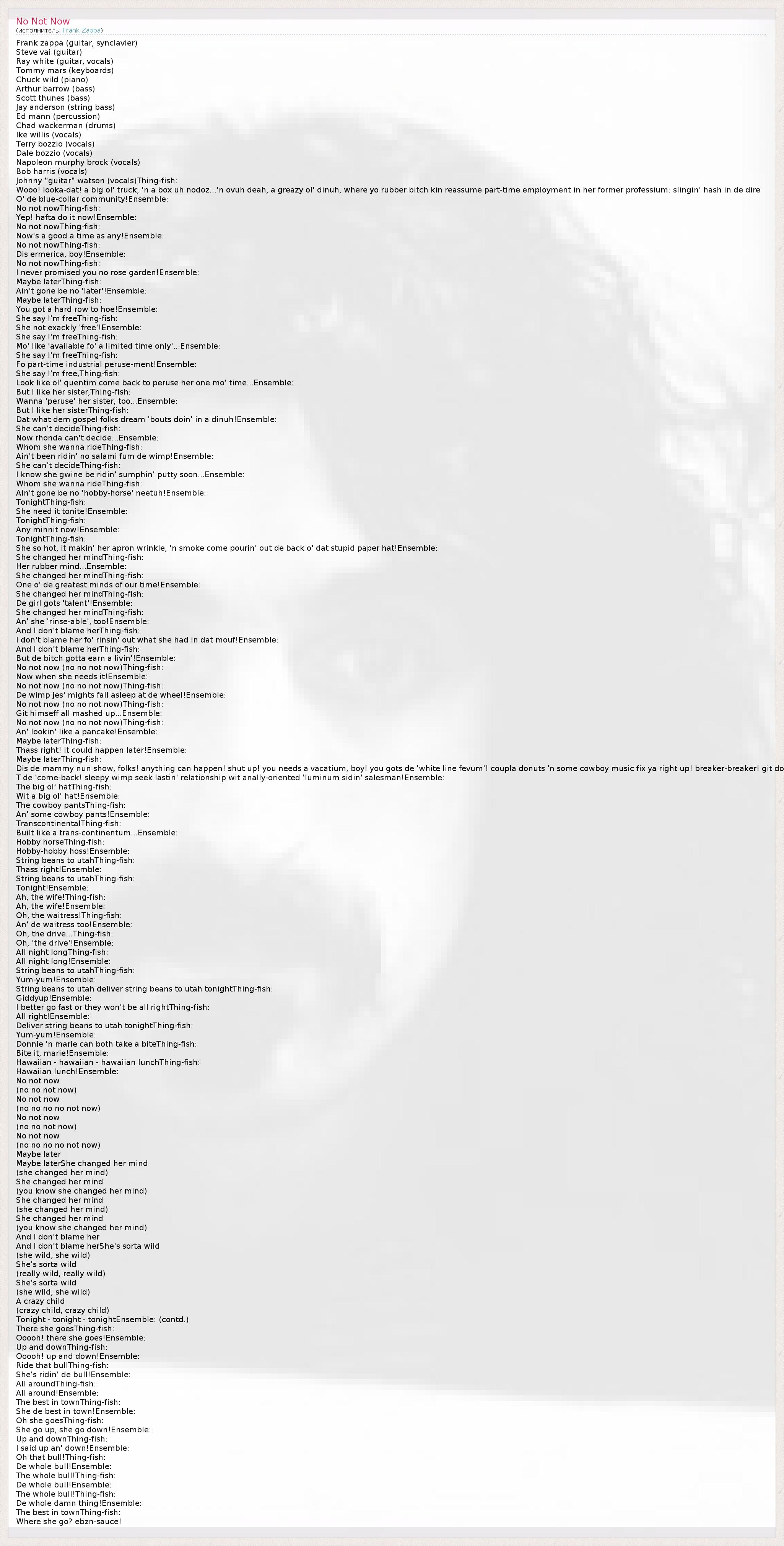 Это интересно:Фрэнк Винсент Заппа (англ. Frank Vincent Zappa, 21 декабря 1940 — 4 декабря 1993) — легендарный американский композитор, гитарист, певец, кинорежиссёр и сатирик. Был руководителем рок-группы The Mothers of Invention. Лауреат премии «Грэмми».За свою 33-летнюю музыкальную карьеру Заппа показал себя одним из самых плодовитых композиторов своей эпохи, выпустив более шестидесяти альбомов, почти все из... продолжение