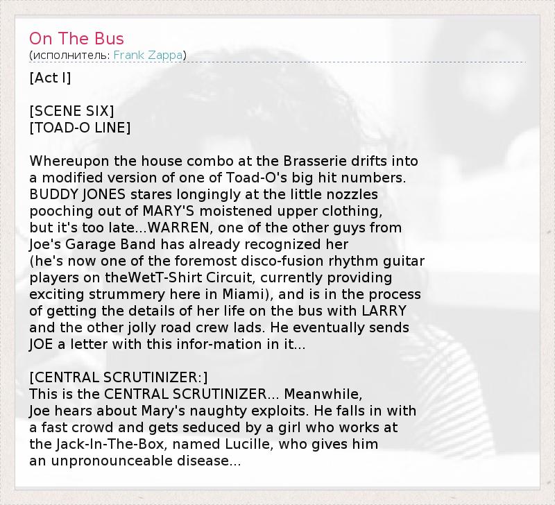 [Act I] [SCENE SIX] [TOAD-O LINE] Whereupon the house combo at the Brasserie drifts into a modified version of one of Toad-O's big hit numbers. BUDDY JONES stares longingly at the little nozzles pooching out of MARY'S moistened upper clothing, but it's too late...WARREN, one of the other guys from Joe's Garage Band has already recognized her (he's now one of the foremost disco-fusion rhythm guitar players on theWetT-Shirt Circuit, currently providing exciting strummery here in Miami), and is in the process of getting the details of her life on the bus with LARRY and the other jolly road crew lads. He eventually sends JOE a letter with this infor-mation in it... [CENTRAL SCRUTINIZER:] This is the CENTRAL SCRUTINIZER... Meanwhile, Joe hears about Mary's naughty exploits. He falls in with a fast crowd and gets seduced by a girl who works at the Jack-In-The-Box, named Lucille, who gives him an unpronounceable disease...