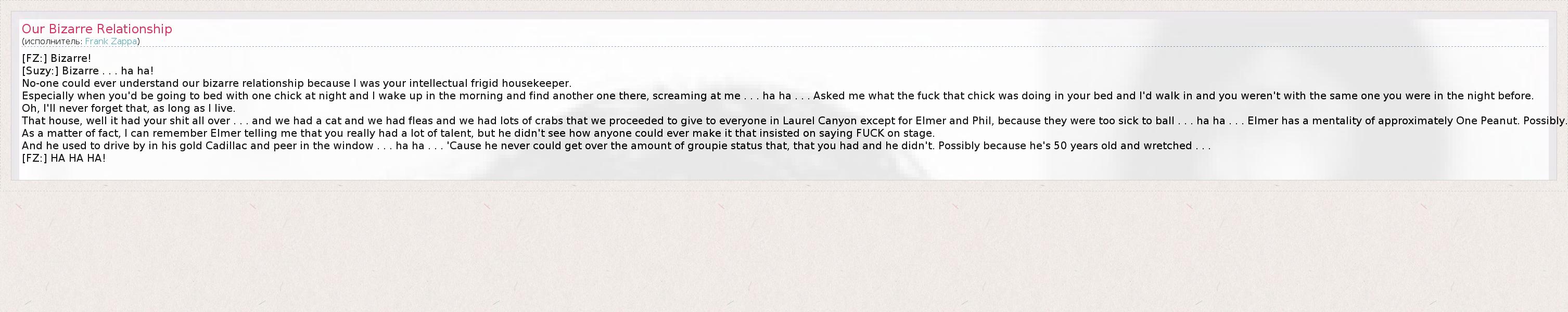 ГлавнаяИсполнителиFrank ZappaOur Bizarre Relationship