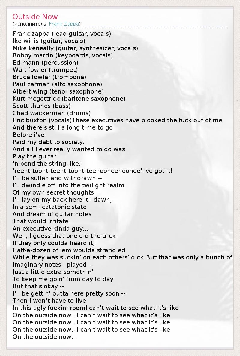 Это интересно:Фрэнк Винсент Заппа (англ. Frank Vincent Zappa, 21 декабря 1940 — 4 декабря 1993) — легендарный американский композитор, гитарист, певец, кинорежиссёр и сатирик. Был руководителем рок-группы The Mothers of Invention. Лауреат премии «Грэмми».За свою 33-летнюю музыкальную карьеру Заппа показал себя одним из самых плодовитых композиторов своей эпохи, выпустив более шестидесяти альбомов, почти все из... продолжение