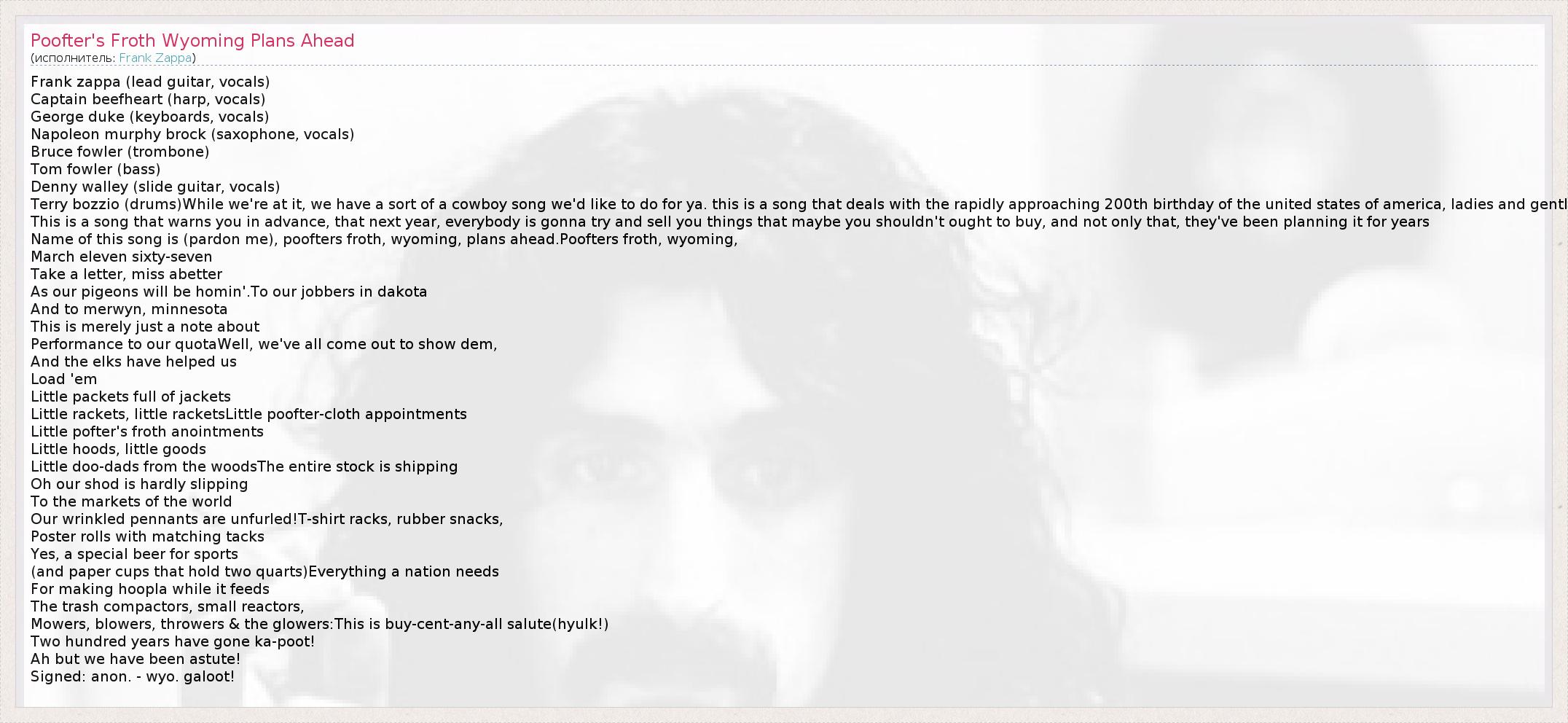 ГлавнаяИсполнителиFrank ZappaPoofter's Froth Wyoming Plans Ahead