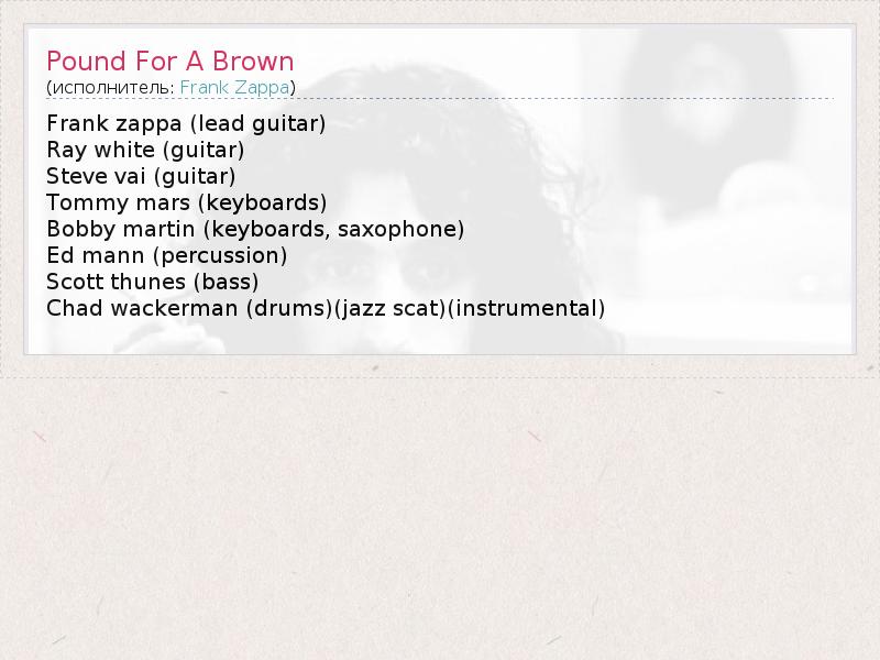Это интересно:Фрэнк Винсент Заппа (англ. Frank Vincent Zappa, 21 декабря 1940 — 4 декабря 1993) — легендарный американский композитор, гитарист, певец, кинорежиссёр и сатирик. Был руководителем рок-группы The Mothers of Invention. Лауреат премии «Грэмми».За свою 33-летнюю музыкальную карьеру Заппа показал себя одним из самых плодовитых композиторов своей эпохи, выпустив более шестидесяти альбомов, почти все из... продолжение